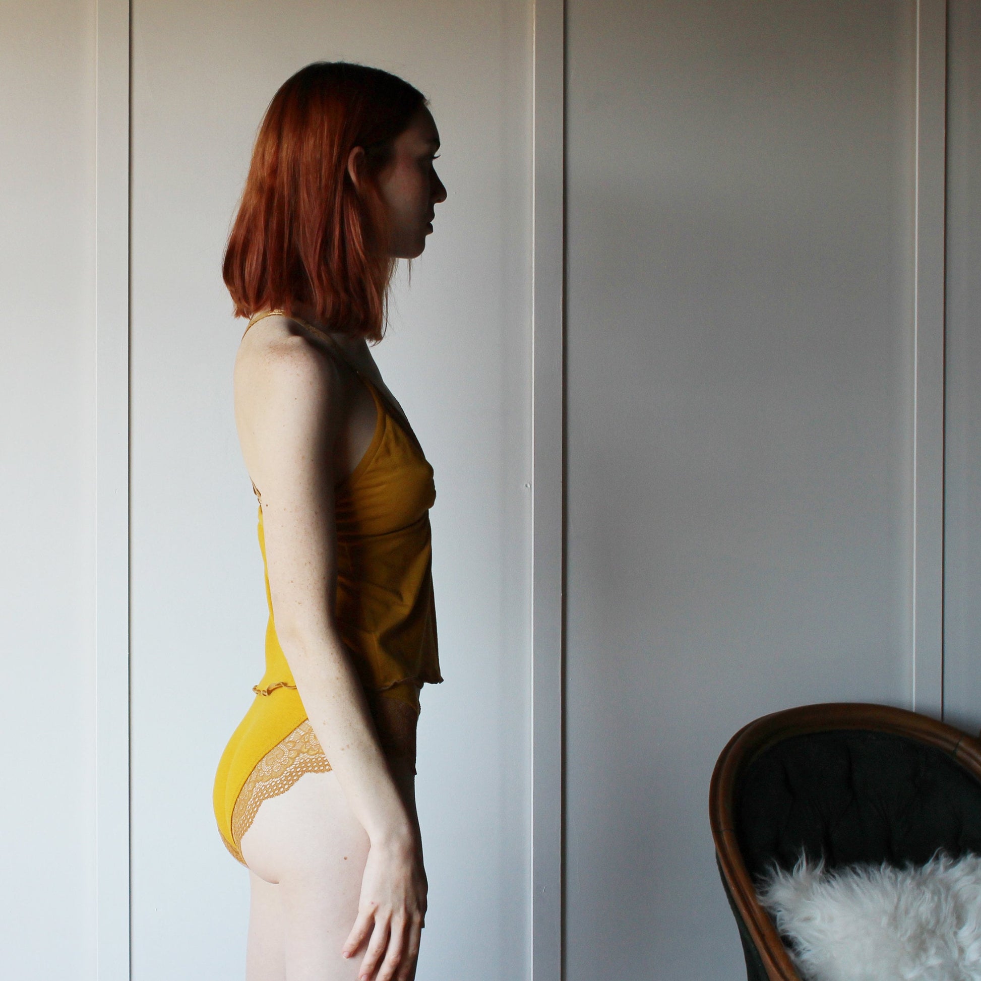 A two piece lingerie set including the camisole with lace trimmed cups and the lace trimmed panties