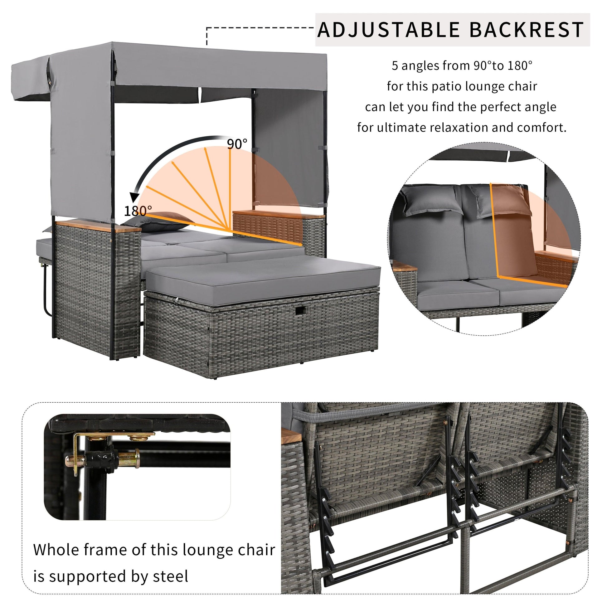 【Outdoor Daybed with Canopy】 :When you feel the dazzling sunshine, the canopy on the top and back can block the sunlight for you, allowing you to comfortably enjoy reading or gaming time. This rattan daybed has 5 tilt angles and is equipped with 2 comfortable pillows. You can adjust the backrest according to your needs and enjoy the comfort at different angles.