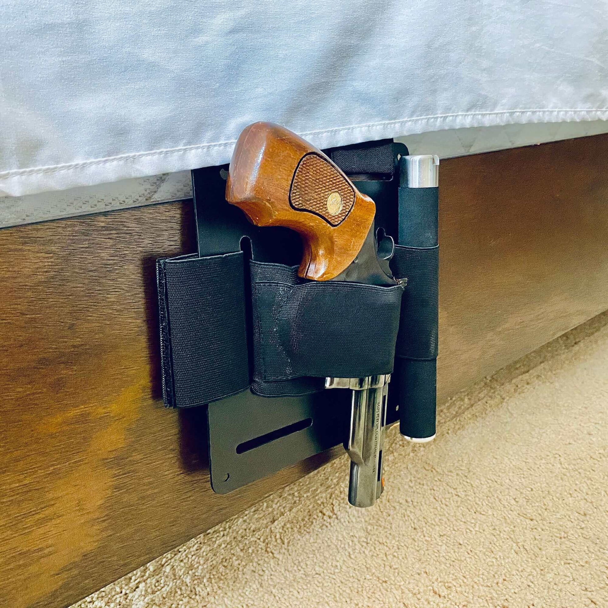 - Original 2-Section design provides multiple safe ways to install the holster to keep the firearm within your reach. It can be placed under the mattress or hung bedside, mounted under the desk or hung desk-side, and folded to fit in a purse.