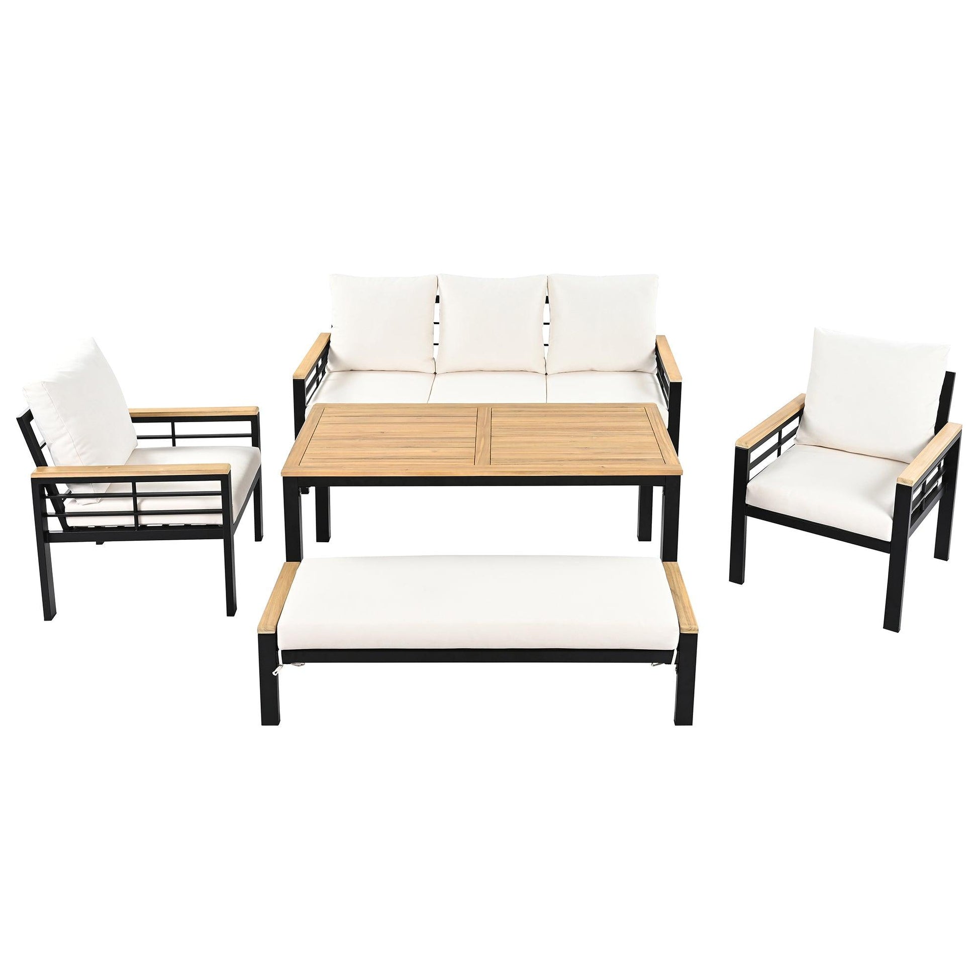 【5-Piece Patio Furniture Set】 :This outdoor furniture set includes 1 table, 1 3-Seat sofa, 2 armchairs, and 1 bench—ideal for 6-8 guests. The sturdy iron frame paired with a solid wood structure ensures enhanced stability and a stylish appearance. The slatted wood tabletop adds rustic charm, combining durability with a timeless aesthetic.