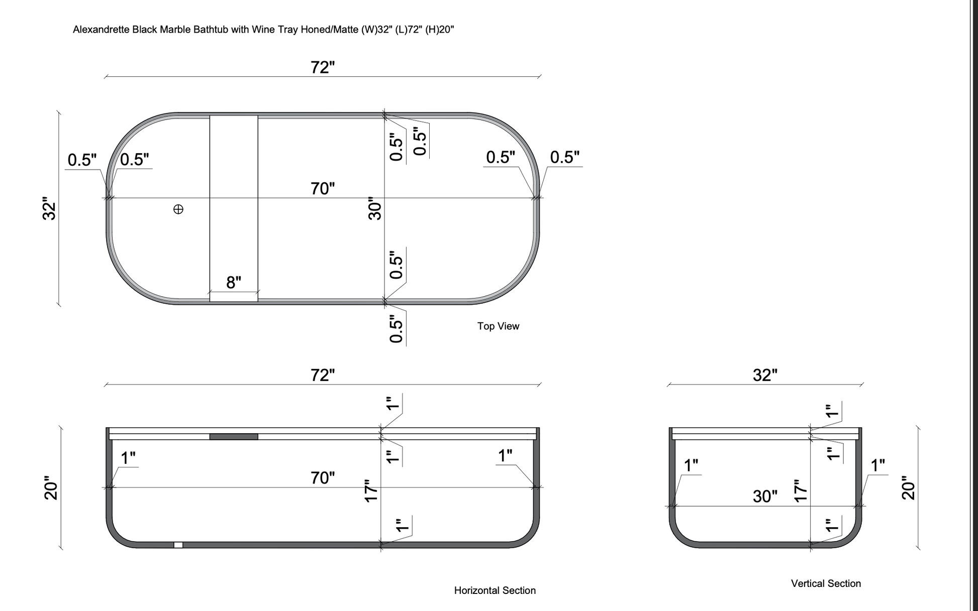 Alexandrette Black Marble Bathtub with Wine Tray Honed/Matte (W)32" (L)72" (H)20"