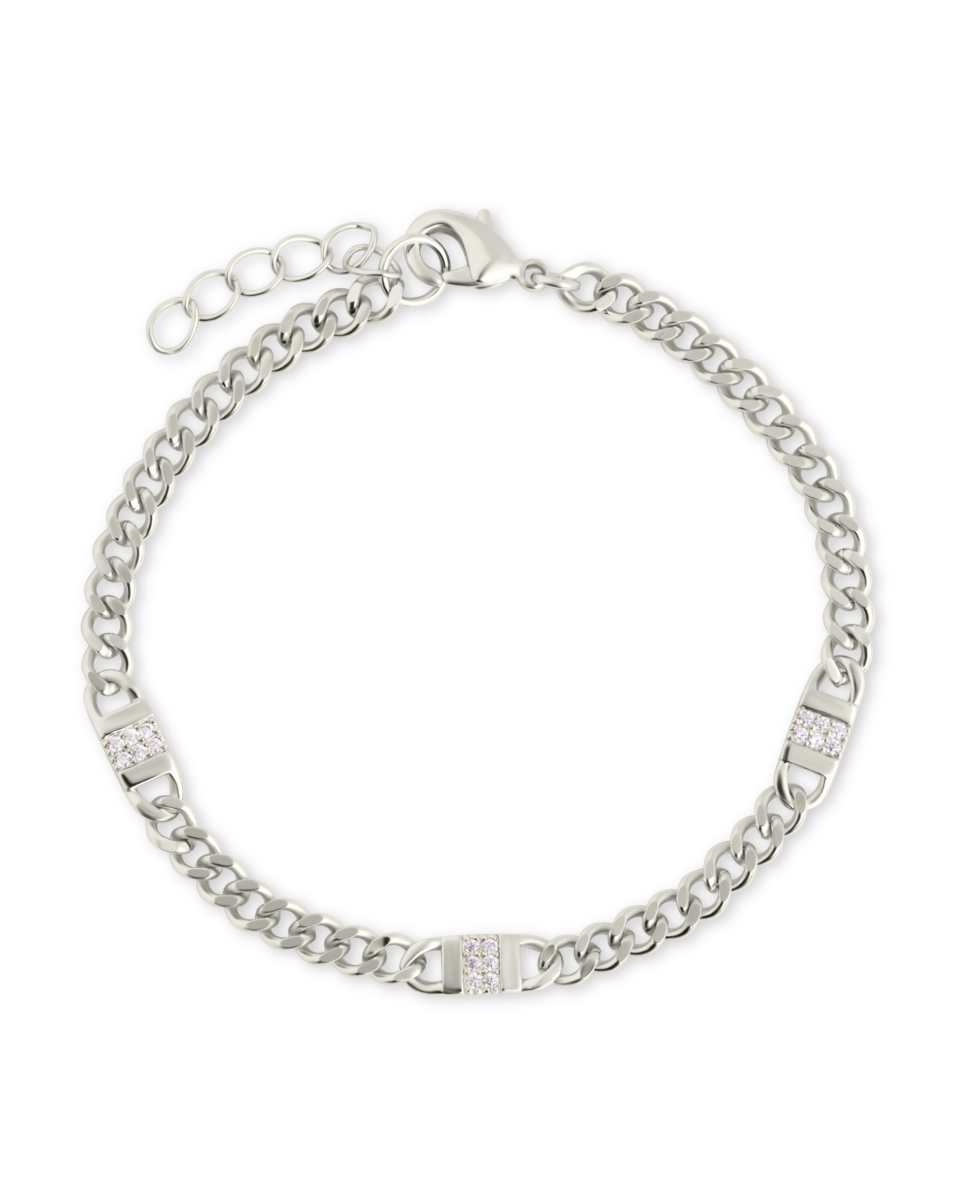 Features: measures 7" with 1" extender, 4x5mm oval links, 3 - 13x5mm links set with 1.5mm CZs, Lobster clasp, Lead and Nickel free
