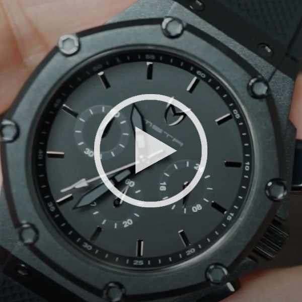Warranty: 2 years limited warrantyIntroducing our new black on black plastic ambassador watch. This new smaller size (40mm) ambassador is made of multi-piece polycarbonate case and bezel. Featuring black stainless steel pushers, crown, and bolts on the exterior and a black dial with silver accents on the inside. This watch is powered by a Japanese 6 hand chronograph Miyota movement which features a stopwatch function and 24 hour clock. All ambassador x models come with an interchangeable rubber strap.