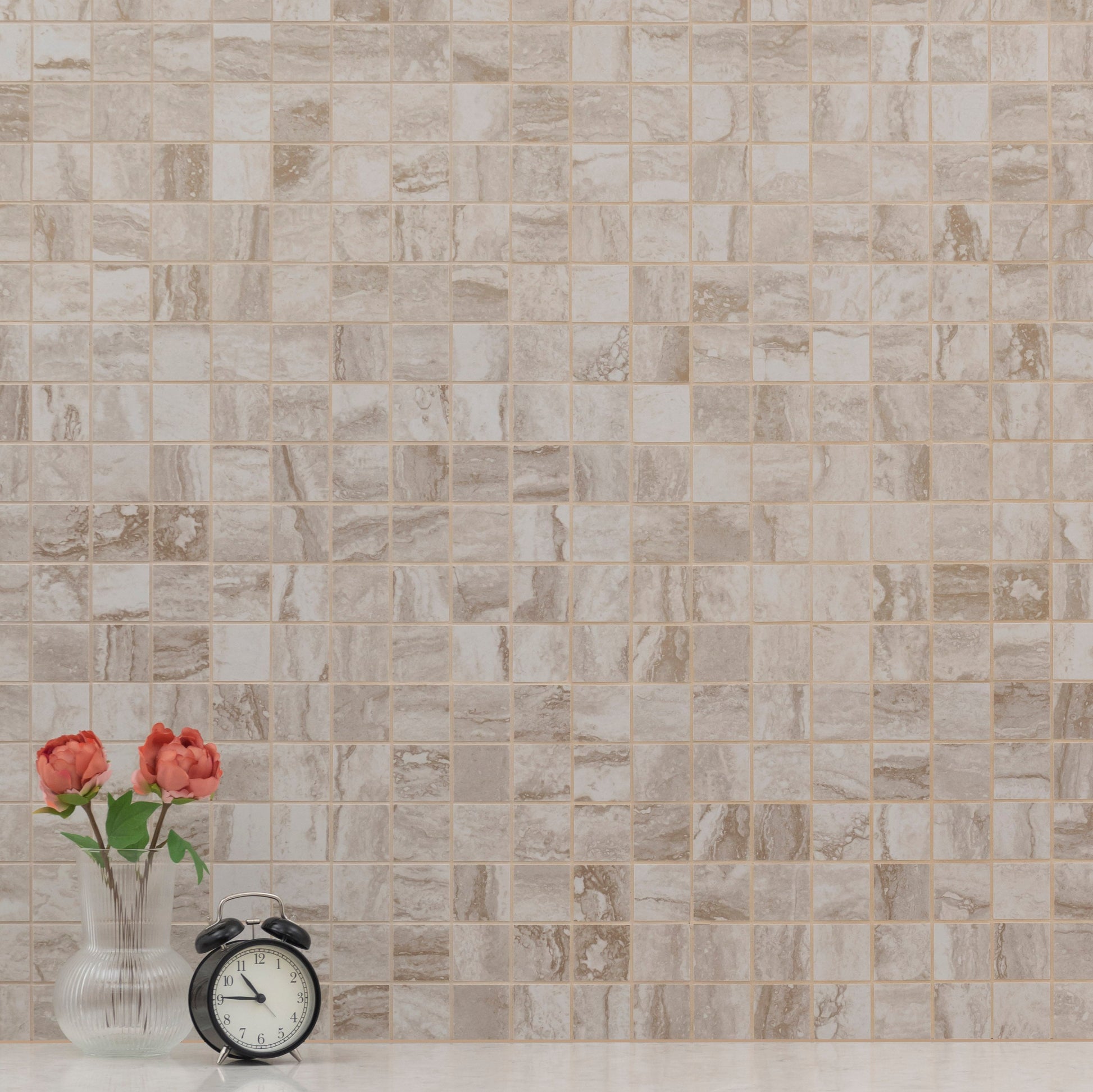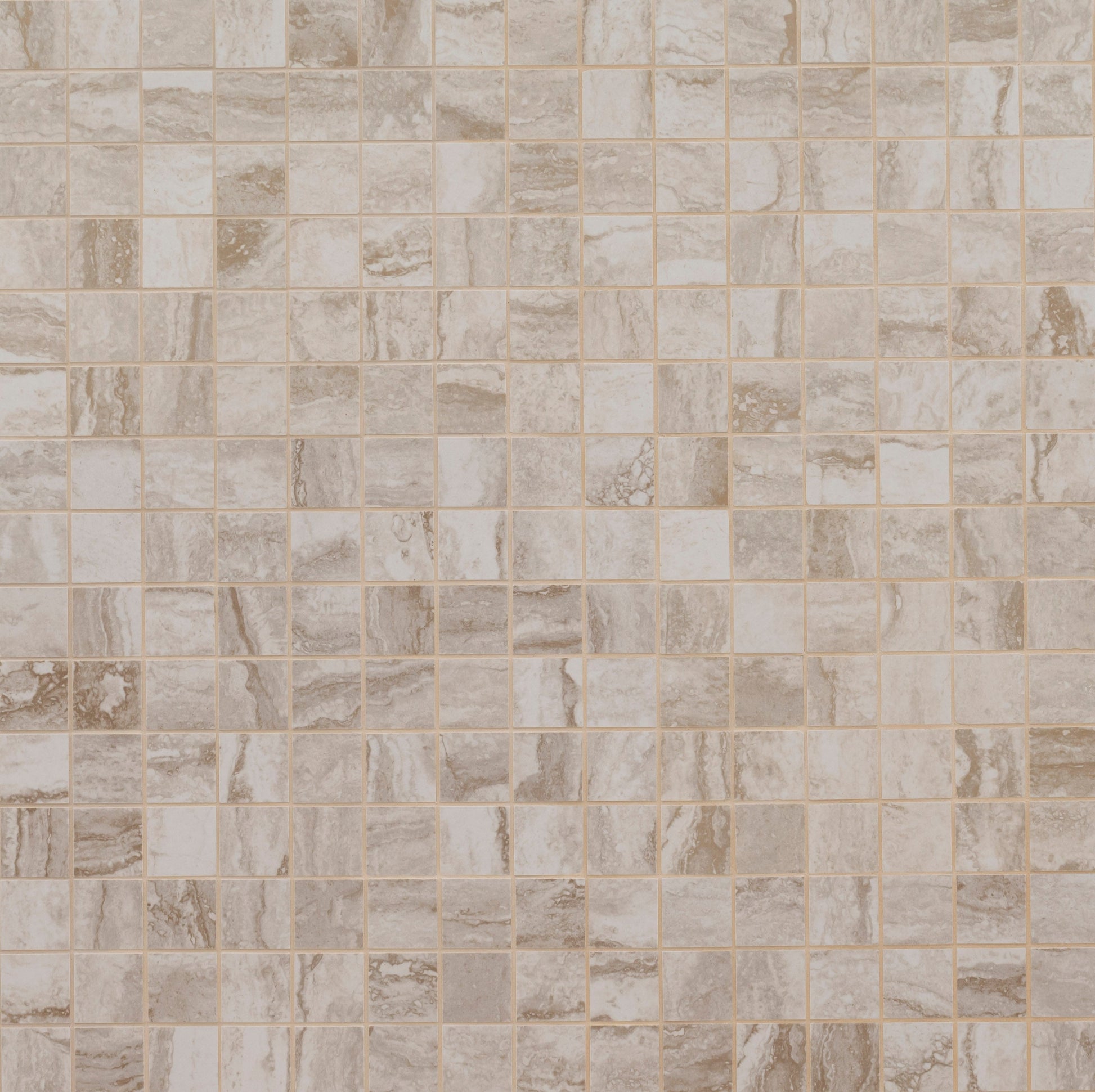 MSI's Bernini Camo 2 in. x 2 in. Porcelain Tile features a background of beige neutrals accented with faux fossilized veining in the most desirable warm gray hues. Offering the luxurious look of travertine, this head-turning mosaic tile is traditional and contemporary all at once. It's popular with homeowners, designers and builders because it harmonizes sublimely with diverse design aesthetics and it's suitable for many residential applications, including walls, floors, backsplashes and shower surrounds. This travertine look matte mosaic tile can also be used in some light-duty commercial applications. This is a rectified tile, mechanically finished on all sides to achieve uniformity. It's precise sizing allows for a thinner grout joint, which results in a clean, professional install and reduces staining issues. Multiple tile sizes, along with coordinating bullnose give your project a finished look.