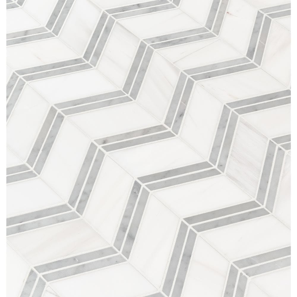 MSI's Bianco Dolomite Cheveron Polished Patterned Mosaic Tile is classic a Turkish marble with a modern edge featuring distinctive, smooth grey veining. It comes in 12"x12" Mesh. It’s ideal for creating beautiful kitchen backsplash, shower surrounds, accent walls, and other design features throughout homes and light use commercial properties. The timeless shape and color of this patterned marble mosaic make it exceedingly versatile — complementing traditional to contemporary design styles. Pair it with a Bianco Dolomite countertop or other mosaics from the collection for a style-savvy cohesive look, or use it alone to add a touch of unexpected detail and interest to any space. Tiles are prearranged on 12"x12" mesh-backed sheets for simplified installation and coordinating moldings give your project a professional look.