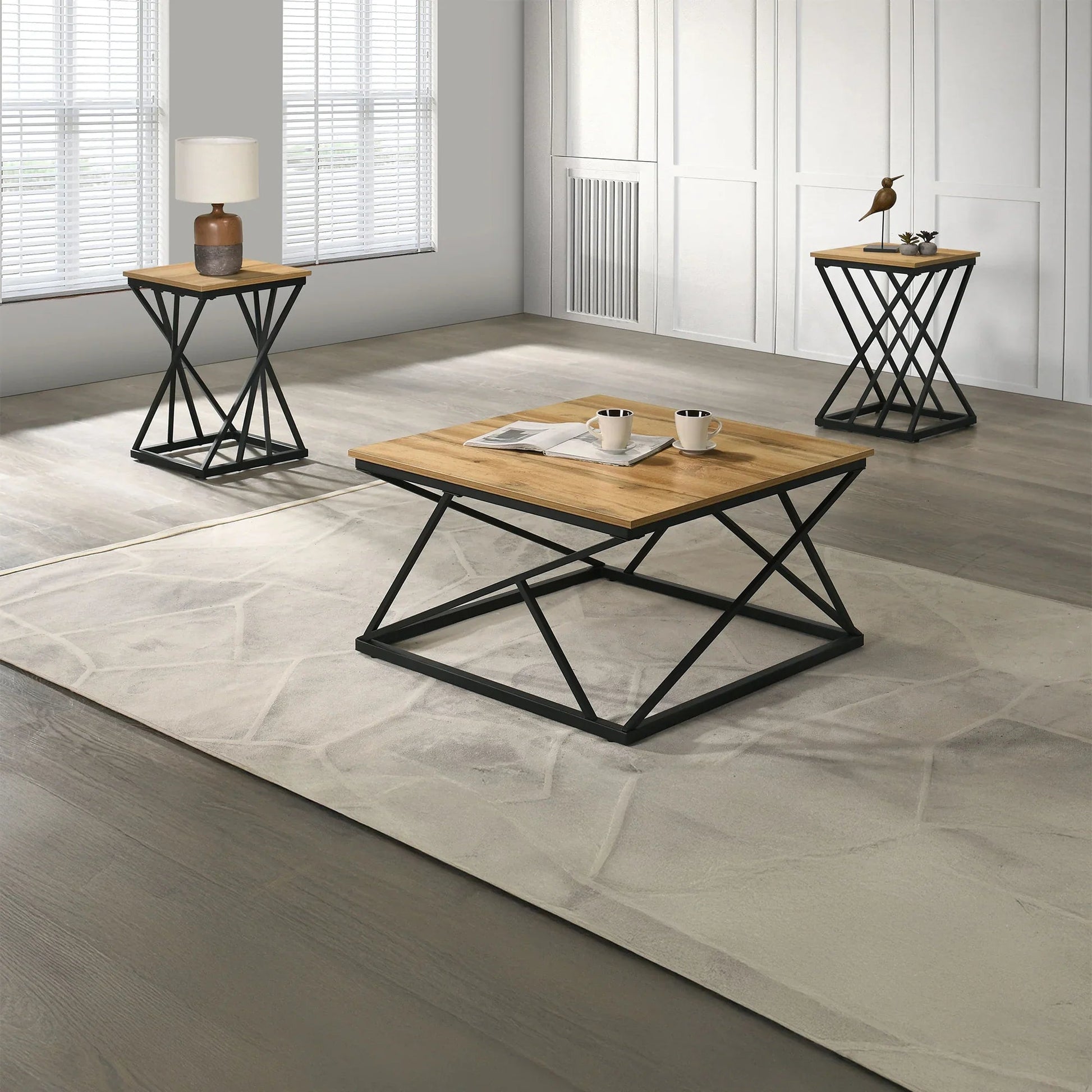 A rustic-chic coffee table set blending wrought iron artistry with warm wood tones for a bold yet inviting living room centerpiece.