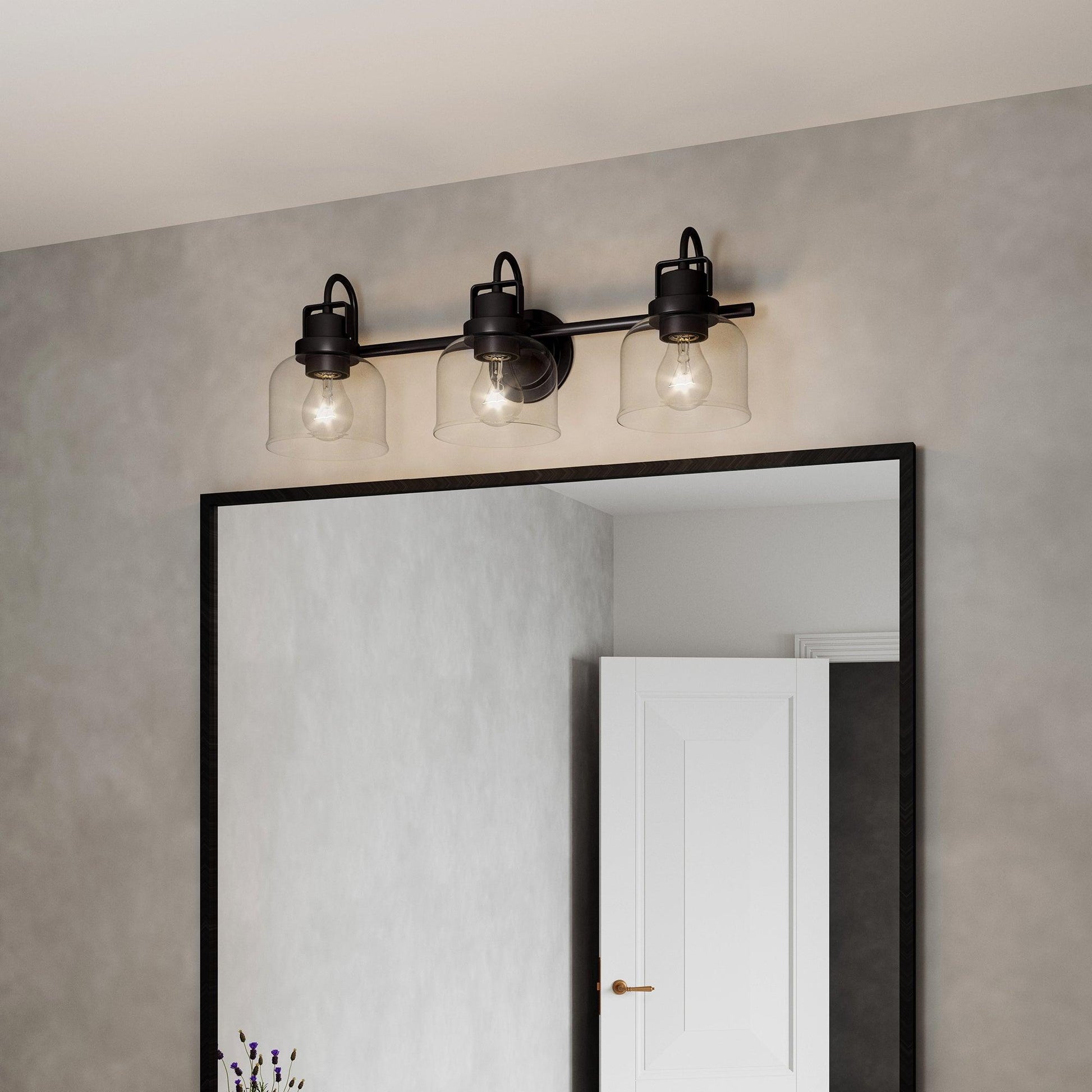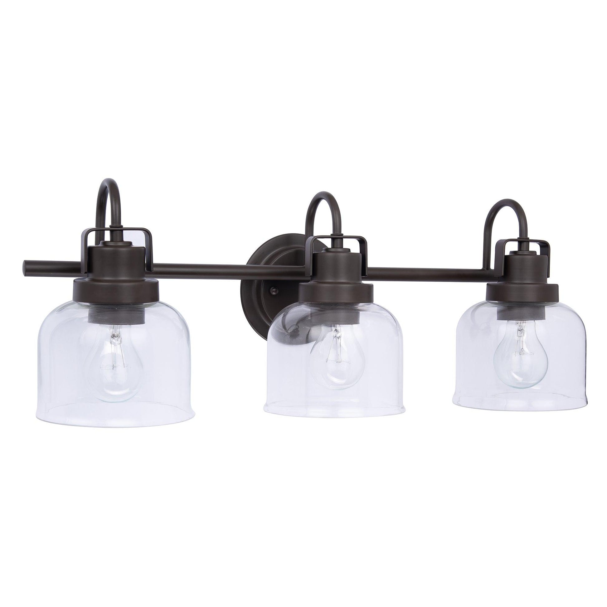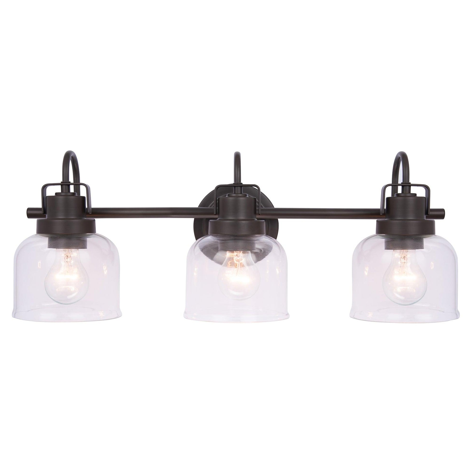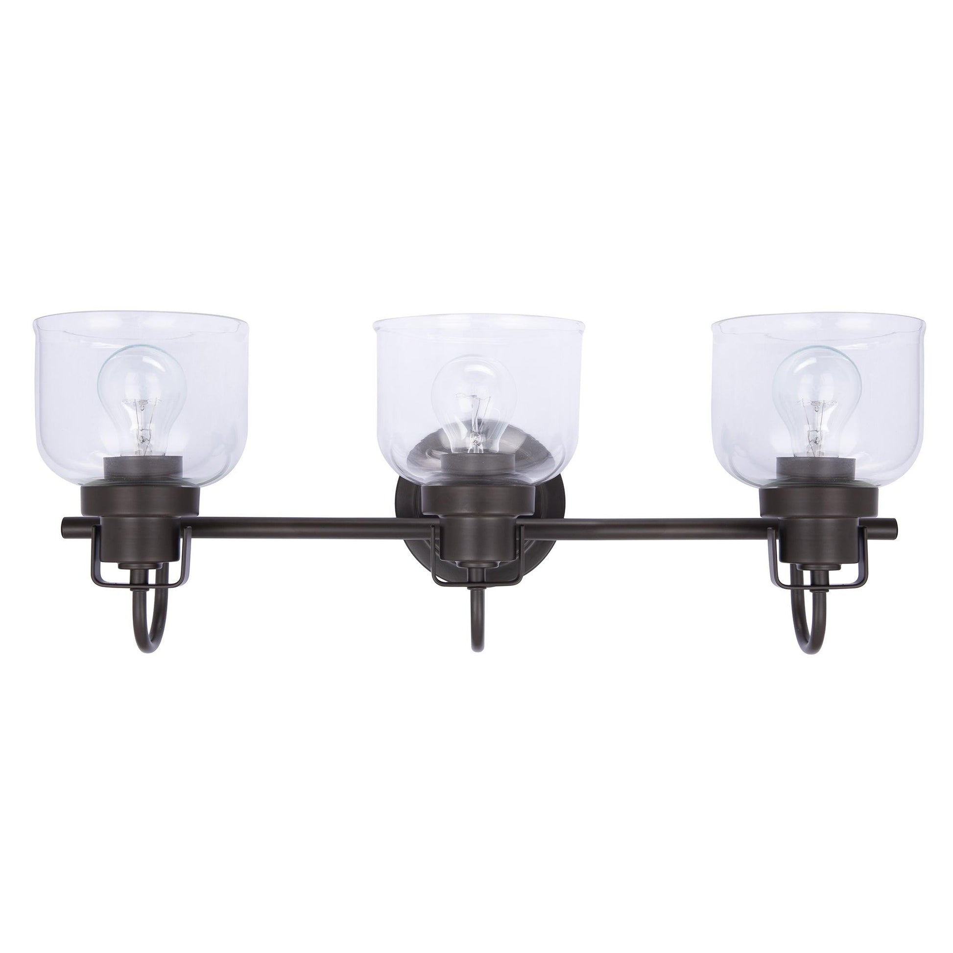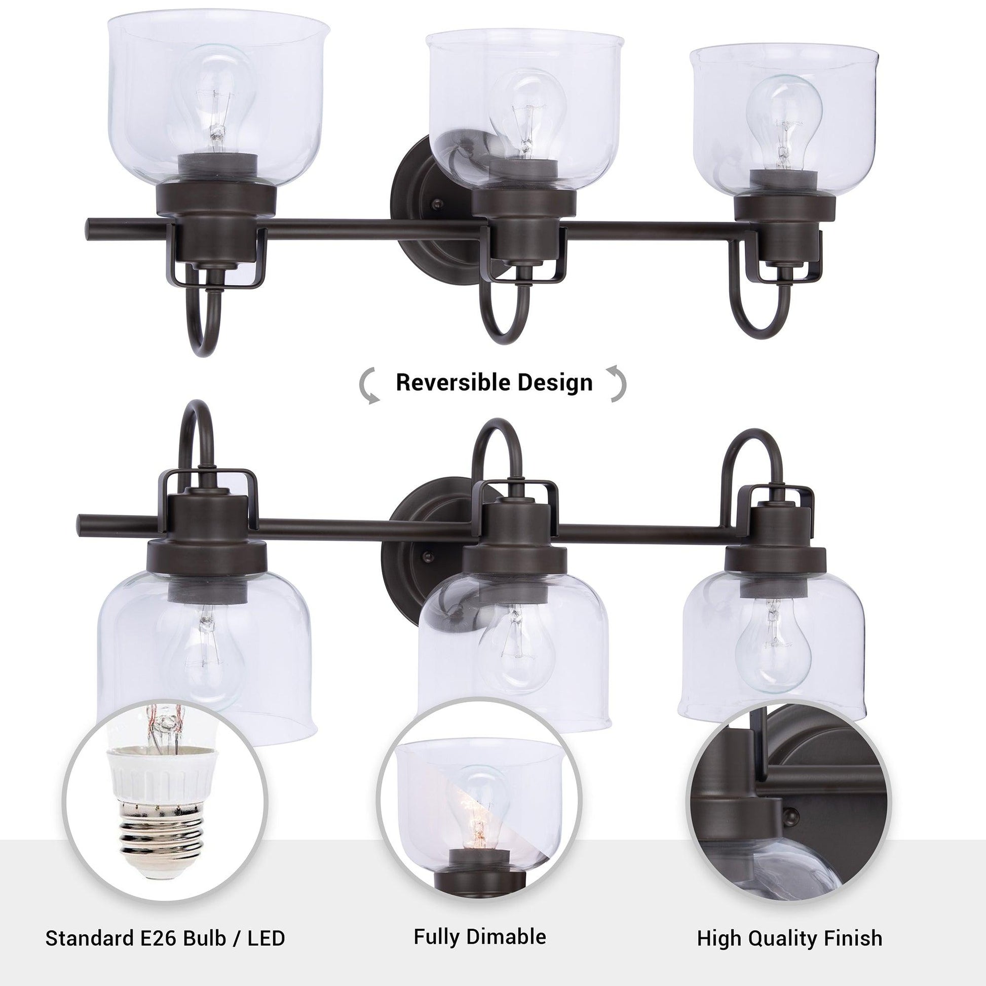 Black, 3-light vanity light displays a modern farm house look for the vanity. The backplate connects to one sleek arm that can easily be mounted up or down thanks to its reversible feature. Two clear glass cups enclose two medium-base bulbs up to 60W, which is not included. This vanity light is compatible with a dimmer switch (not included), so you can adjust the lighting to match what the room requires.