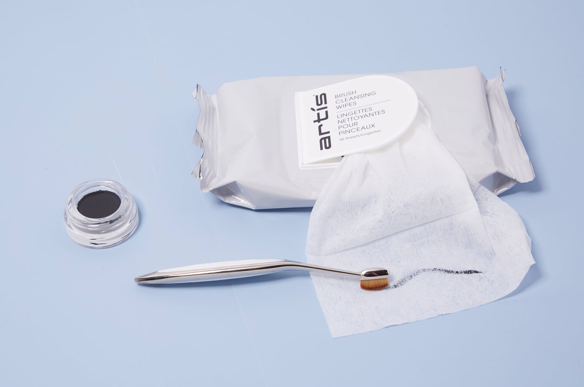 - Gently massage the brush fibres with the wipe to help dissolve makeup residue.