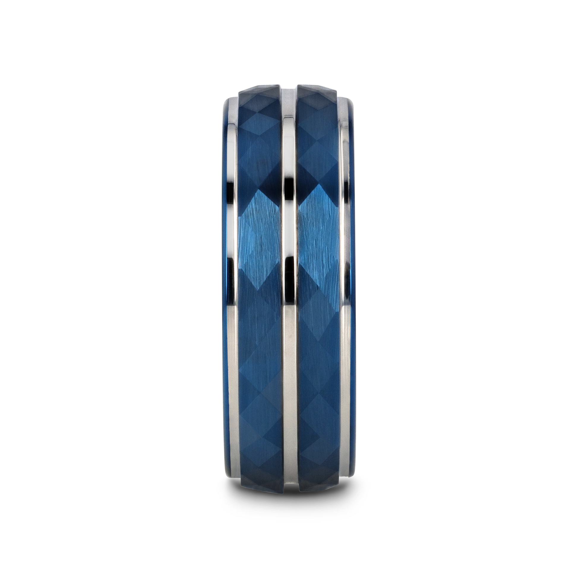 CARMEL Blue Ion Plated Tungsten Carbide Men's Ring With Faceted Center And Stepped Edges - 8mm