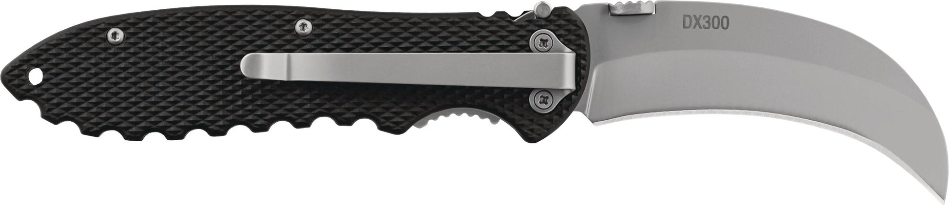 The DX300 is designed for jobs like cutting carpet, trimming linoleum, and pruning plants. Utilizing our Double Lock technology, anyone can work with confidence knowing that the added safety prevents the knife from accidentally closing. The nylon handle is checkered and molded for a secure grip. The knife easily opens with one hand using the thumb studs on the blade, and you can keep it secure with a deep-carry pocket clip.