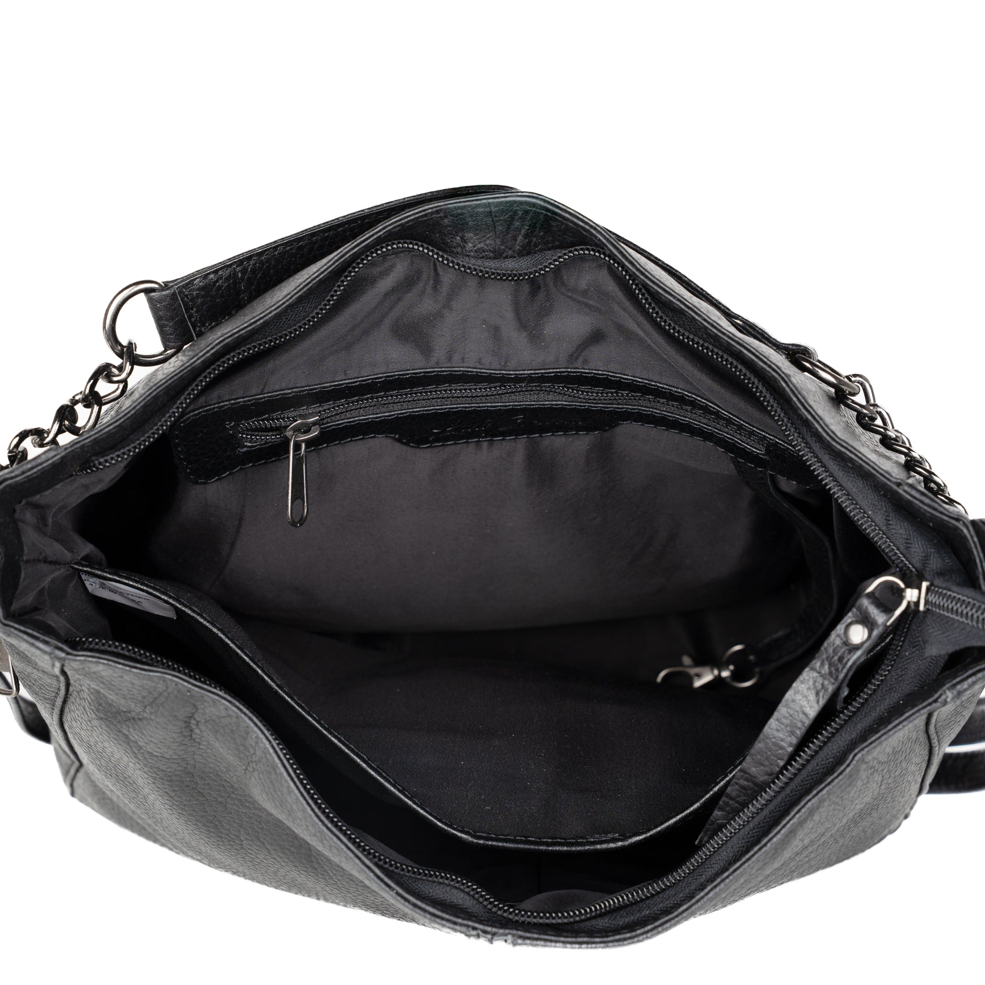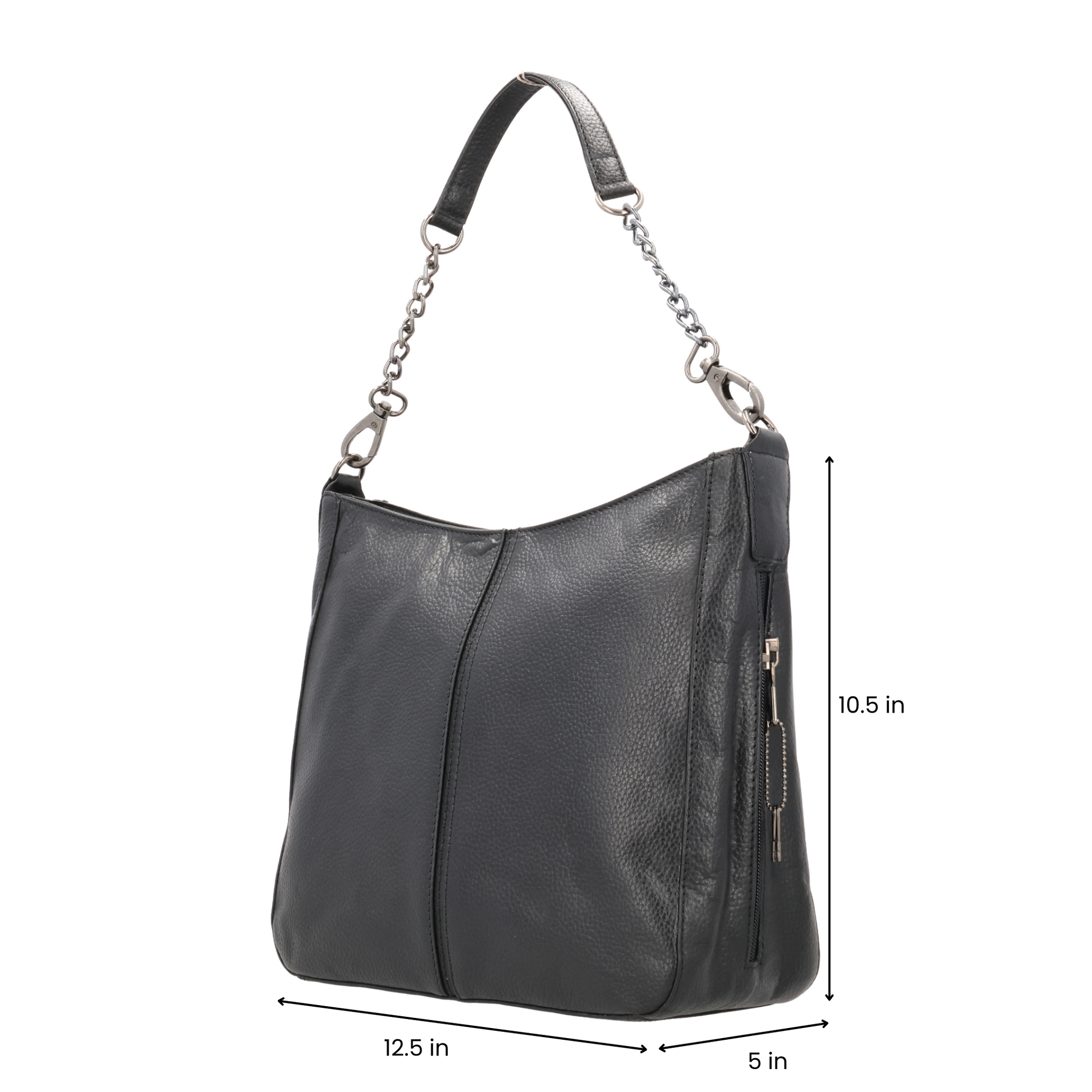 The Ava Concealed Carry Hobo is crafted from genuine buffalo leather, combining style and practicality. The single-handle chain strap adds a sophisticated touch. You can choose between the single-handle chain strap or the adjustable shoulder strap for crossbody use, which measures 33" - 58" L (drop 16"- 30") width 3/4" and clips on and off with ease.