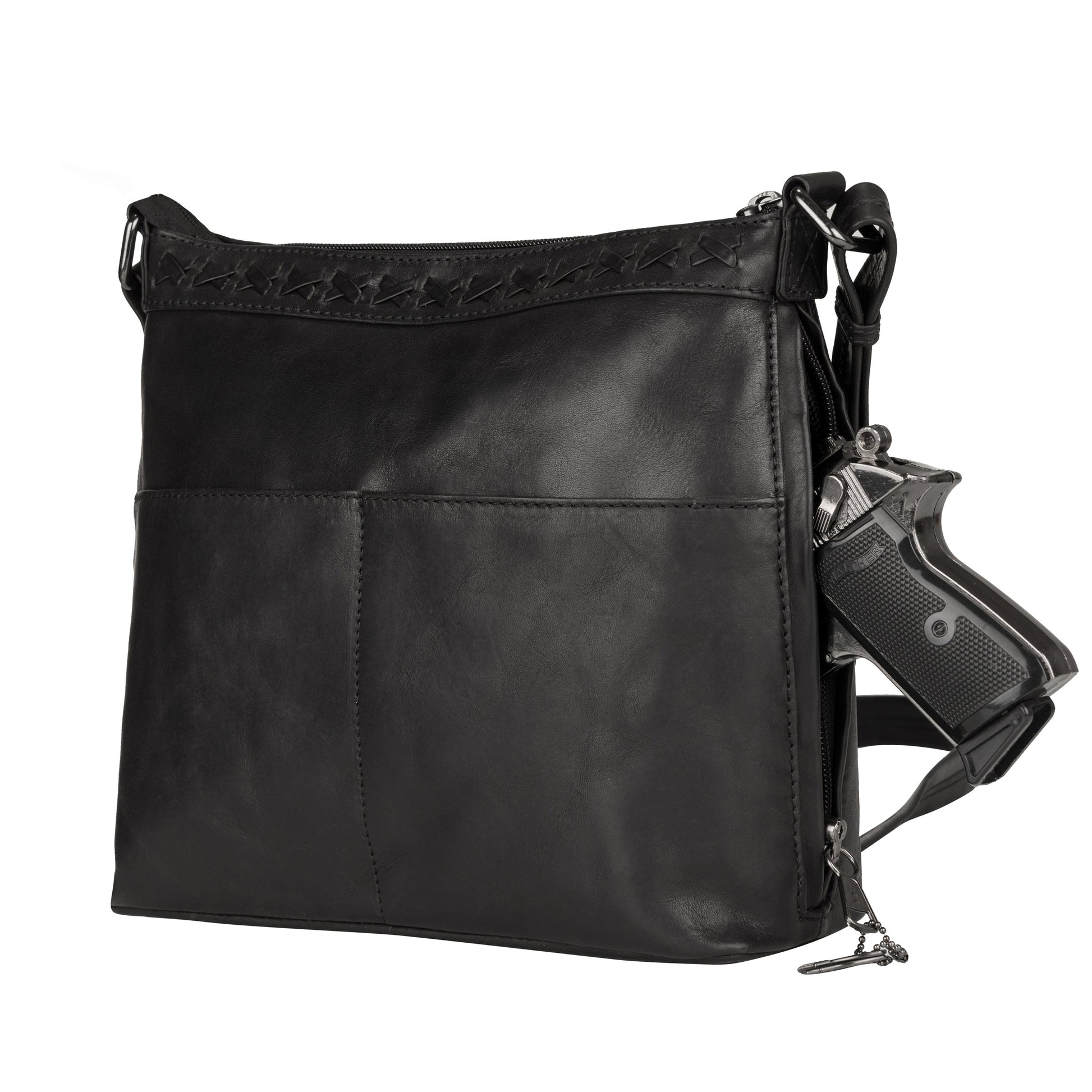 The concealment compartment is secured with YKK locking zippers which are discreetly hidden with leather flaps. It is located in the center of the purse and measures approximately 10” L x 6.5” H. It is designed for right or left-handed users and features wear-resistant nylon. A large-frame handgun can be easily accommodated. A universal holster is included which features Velcro on both sides for a secure fit in the concealment pocket.