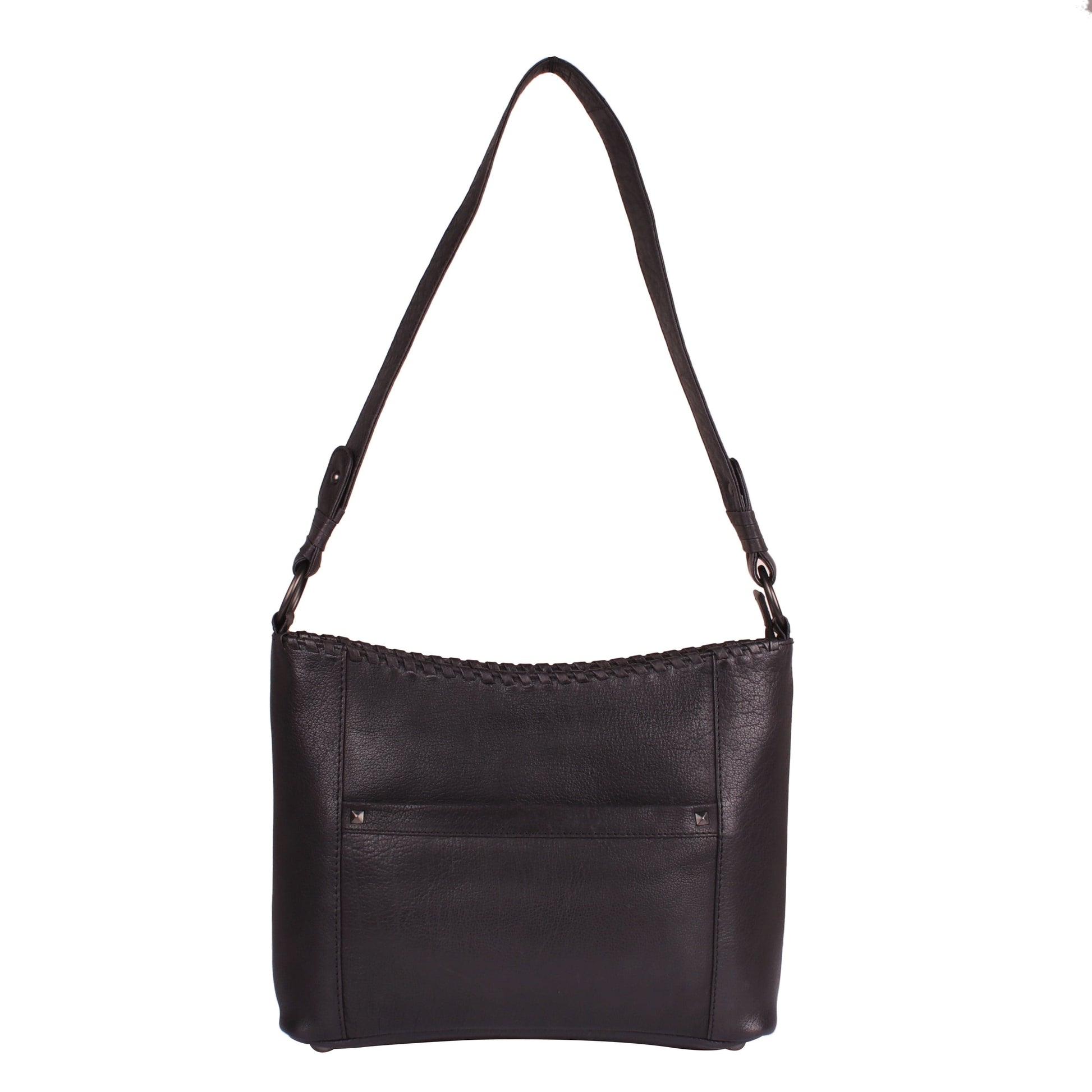The elegant Juliana Leather Hobo by Lady Conceal is constructed with quality genuine leather. Intricate leather lacing around the top adds a refined touch. This bag features a full-length zippered pocket that divides the interior into two compartments. The front has 2 roomy slip pockets, the back features a privacy zippered pocket, a large open pocket, and a leather key strap. Another open slip pocket on the back adds more room for your cell phone or other essentials. The shoulder strap measures 32” L with a 16” drop.