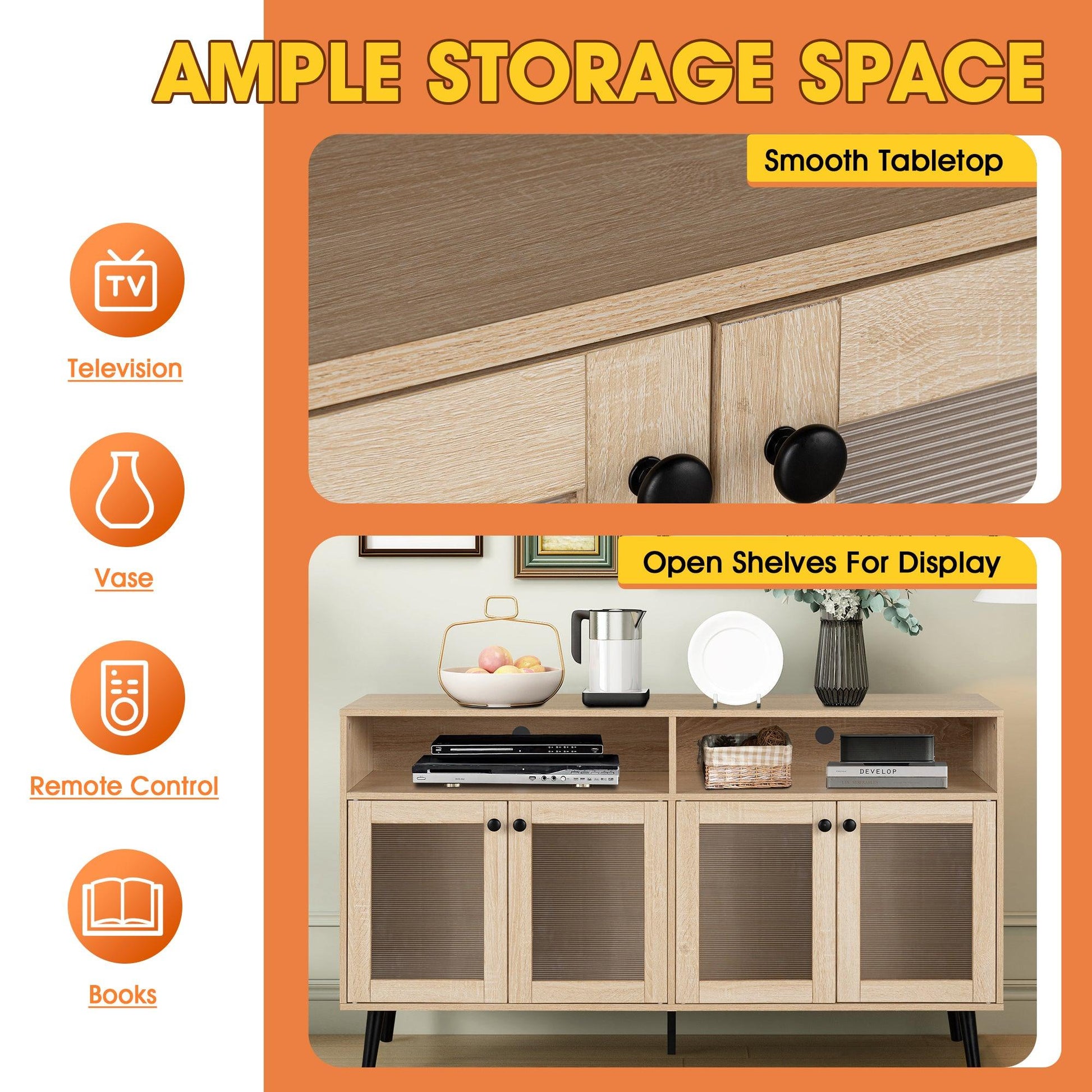 【Mid-Century Style】 :Elevate your living room with this natural-colored TV stand, featuring a mid-century modern design with tapered legs and fluted door panels—perfect for enhancing your multiple spaces.