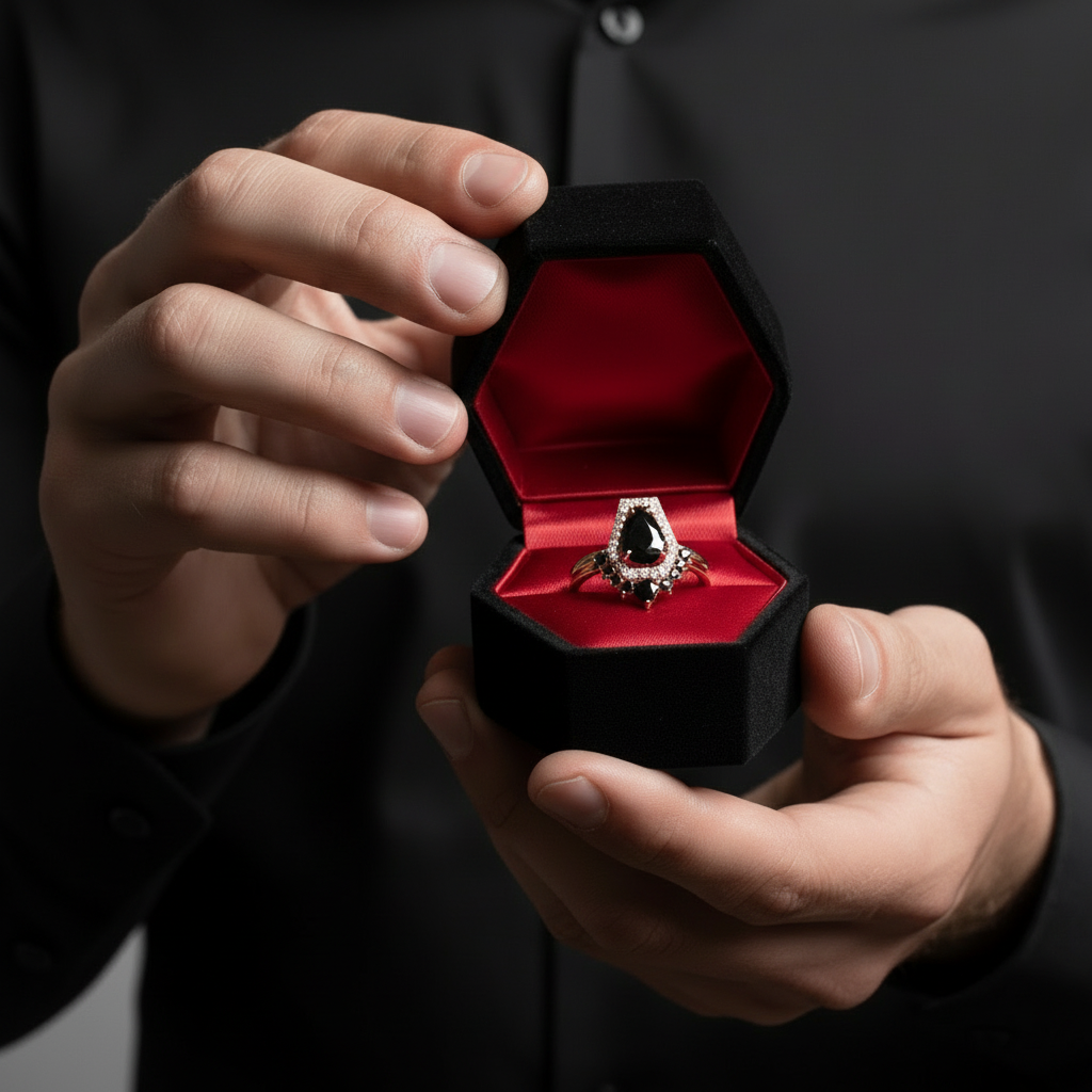 "Experience a love beyond measure." - Imbue your commitment with glamour and elegance with the Faithfulness-1ct Black Pear Cut Diamond 14k White Gold Coffin Ring Set, crafted by the skilled hands of New York's renowned designers and jewelers. Each certified moissanite gem is skillfully faceted and cut, radiating beauty and loyalty.