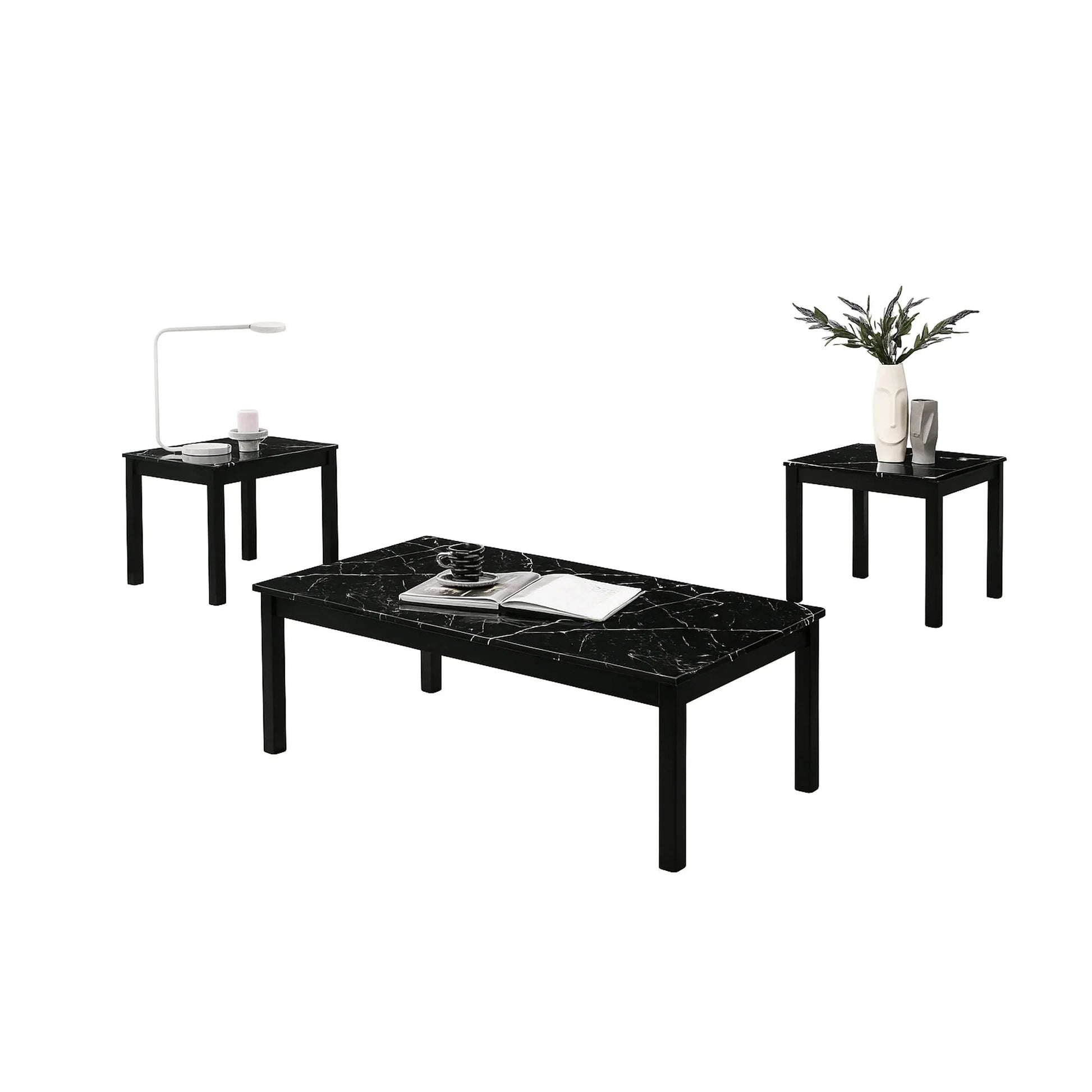 This 3-piece coffee table set includes 1 spacious coffee table and 2 matching end tables, all featuring elegant faux marble tops for a sophisticated look. The sleek, modern design of the tables complements any living space, adding a touch of luxury without the high maintenance. Perfect for both style and practicality, this set offers ample surface space while maintaining a chic, contemporary aesthetic.