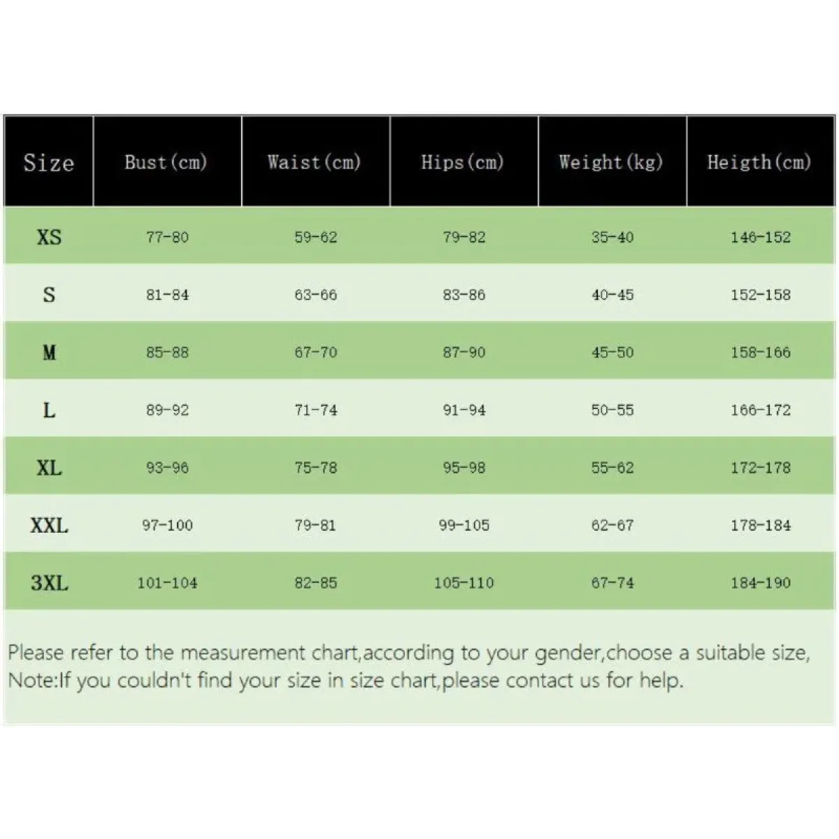 | Size | Bust (cm) | Waist (cm) | Hips (cm) | Weight (kg) | Height (cm) |