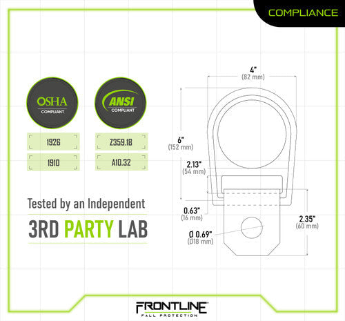 The Frontline swiveling anchor incorporates a d-ring design that conveniently allows the d-ring to rotate 360 degrees as well as flip back and forth at 180 degrees. The anchor can be used for anchoring at concrete walls, ceilings, columns, or other concrete structures. The concrete anchor is reusable and the bolt can be easily replaced when moving onto the next work area. The anchor can be used and installed in vertical, horizontal and overhead applications and it includes the bolt so it's ready to be used straight out of the bag.