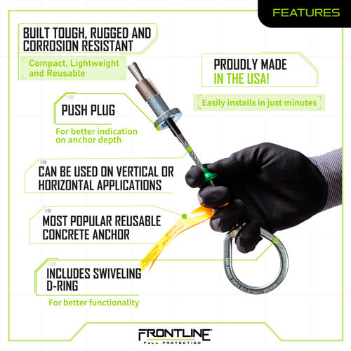 The Frontline reusable anchor bolt is our most popular anchor for concrete applications! The reusable anchor bolts are portable, easily installed and can be used in a variety of fall protection applications. Once the correct opening in the concrete is done, the reusable anchor bolt is then installed in a matter of seconds and can be conveniently used on vertical or horizontal applications. Its ease of use and functionality helps users install and relocate onto the next anchoring location quickly maintaining a good level of productivity while preserving the upmost safety compliance .and user confidence