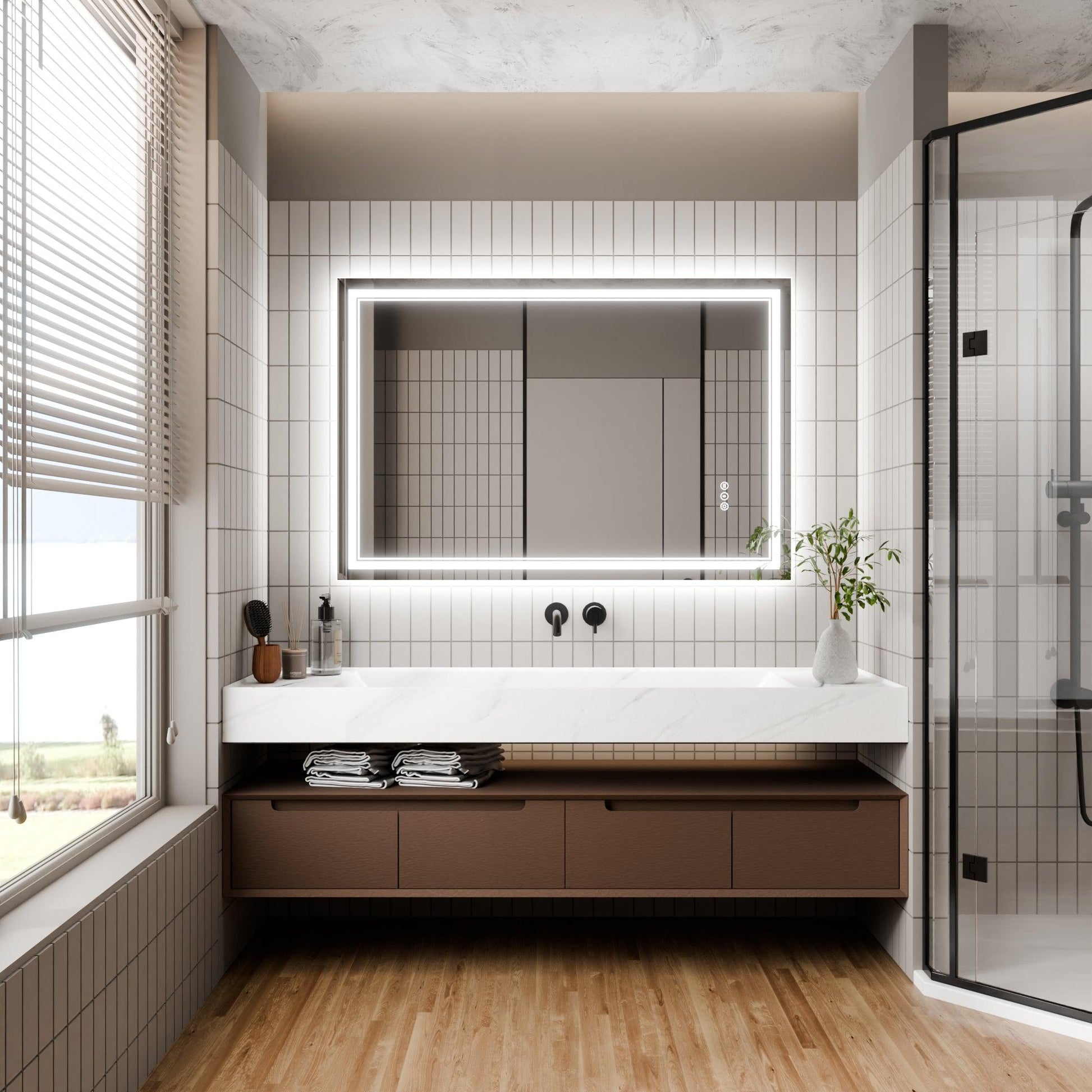 The Led bathroom mirror is modernly designed with frameless frosted edges, not only gently shine on your beautiful face, but also add artful details to your space.