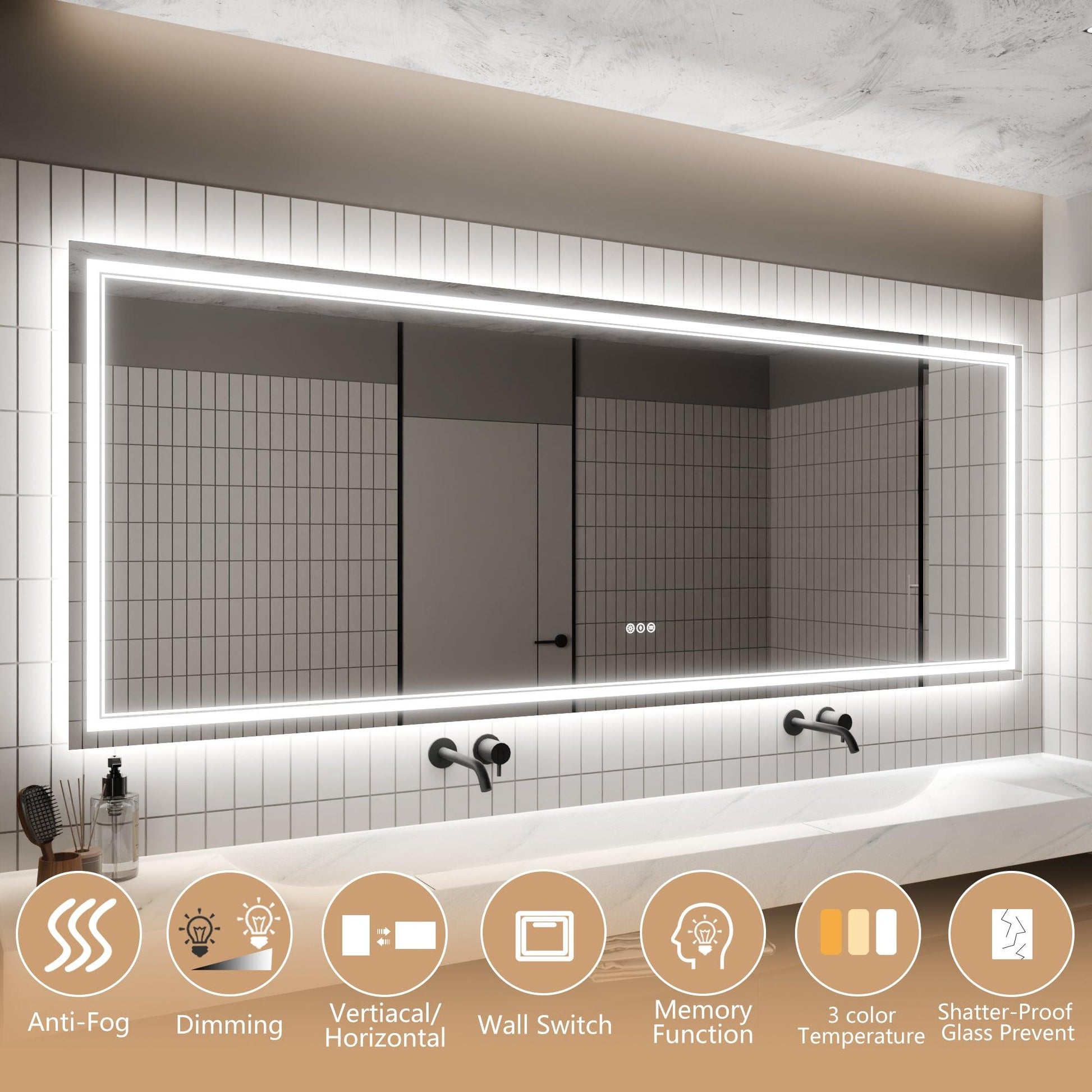 【Memory Dimming Button】 :Holding a touching light button to adjust your wanted brightness, full range dimmable, the led bathroom mirror will memory your last time use it. Support wall switch control on/off. Single-click the button could change the LED temperature between Warm (3000K)/ Daylight (4500K)/ White light (6400K).