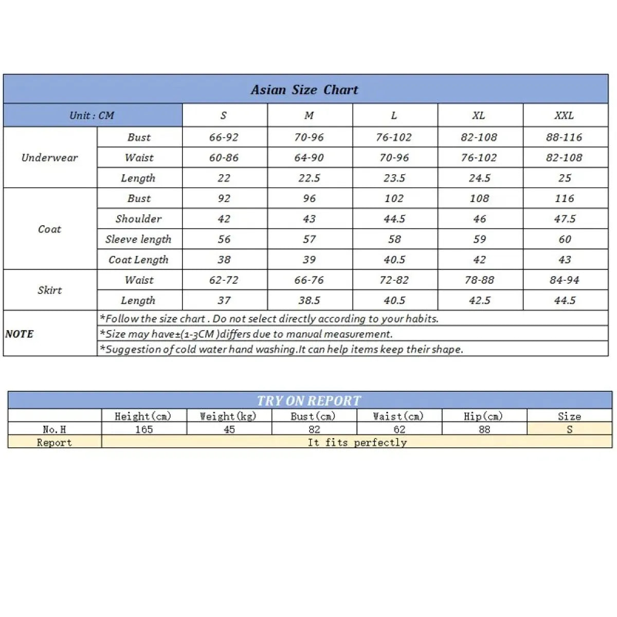 | Bust (cm) | Bust (inches) | Length (cm) | Length (inches) | |