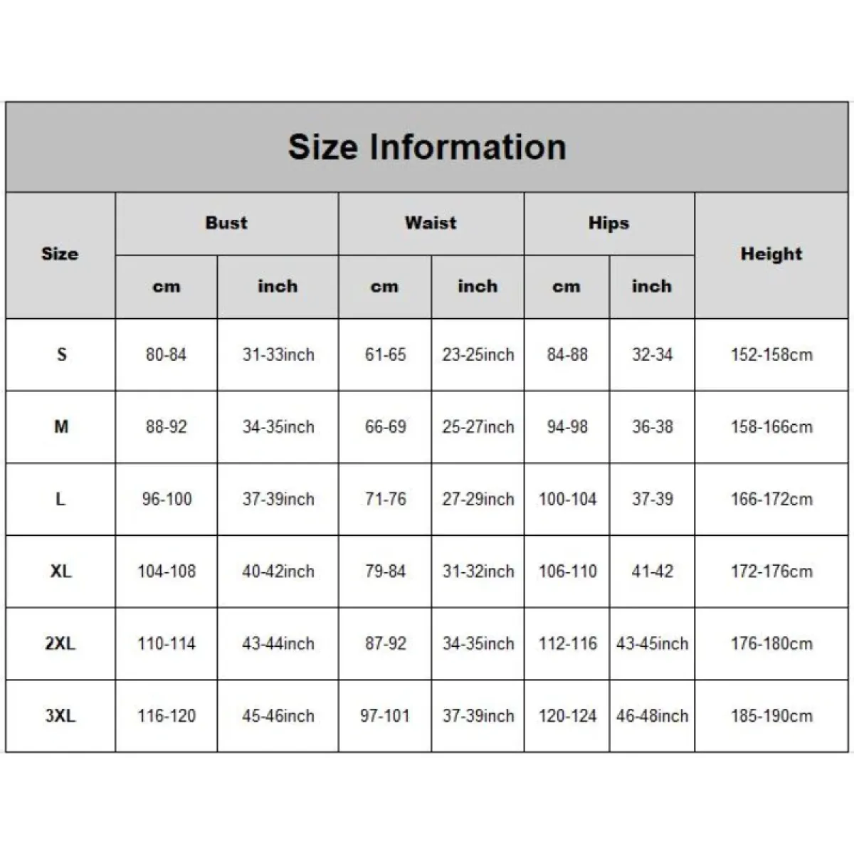 | Size | Bust (cm/inch) | Waist (cm/inch) | Hips (cm/inch) | Height (cm) |