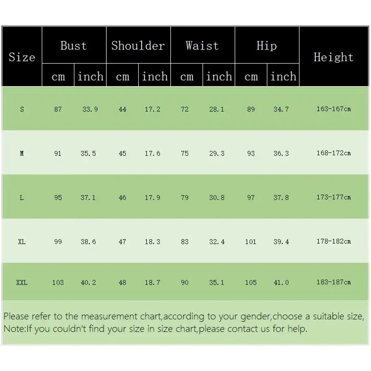 | Size | Bust (cm/inch) | Shoulder (cm/inch) | Waist (cm/inch) | Hip (cm/inch) | Height (cm) |