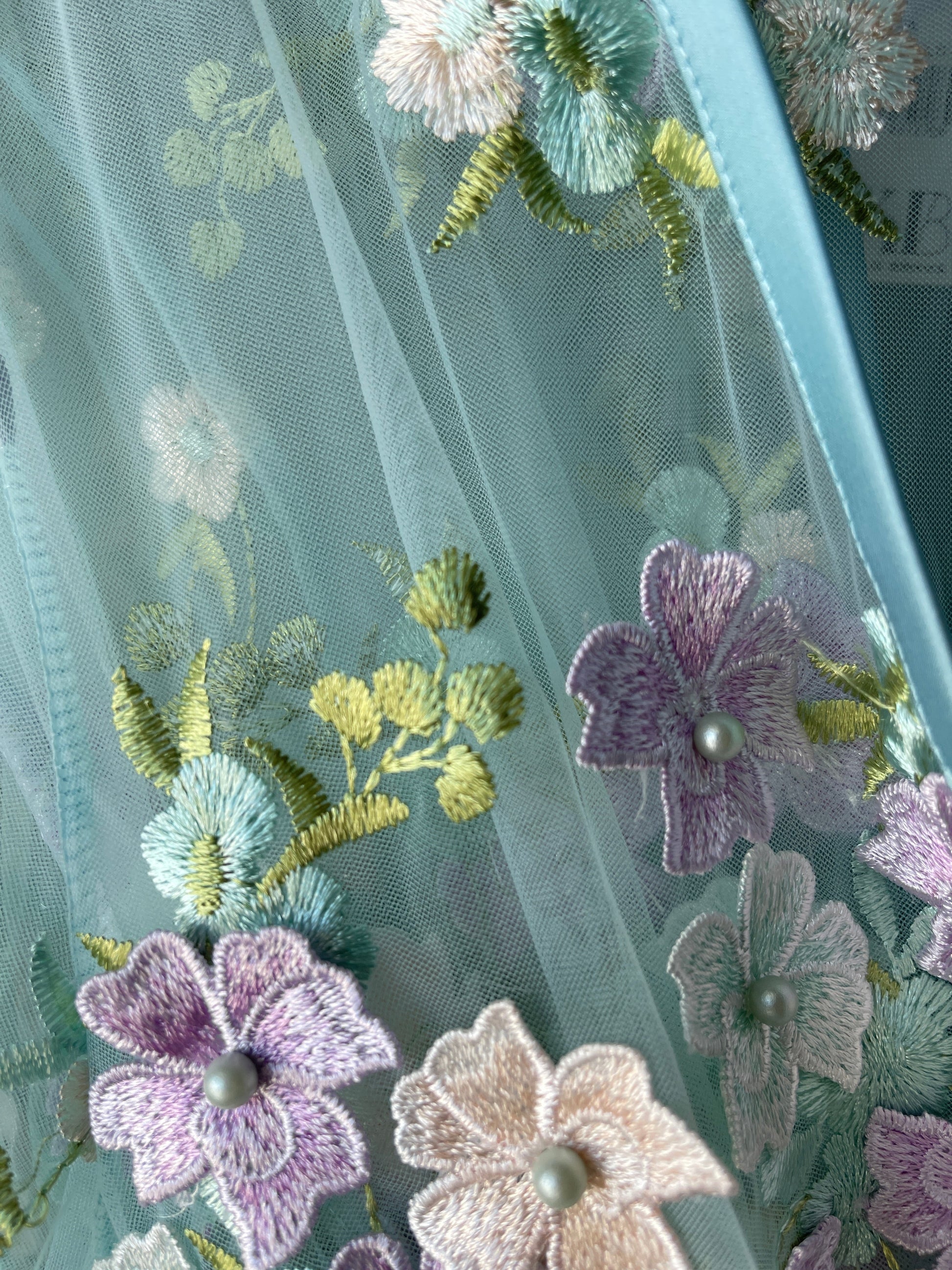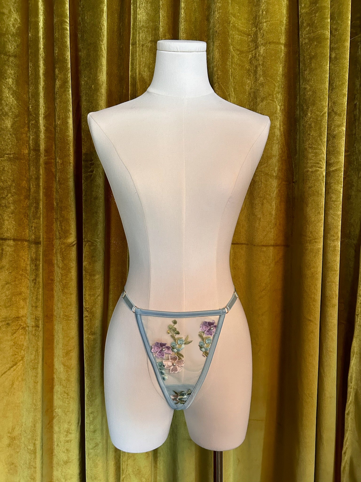 G-string made with fully embroidered sheer powder blue mesh. Multicolor florals and pearls. Trimmed with satin. Cotton gusset. Pair with the Mini Slip or matching Robe for the sweetest set!