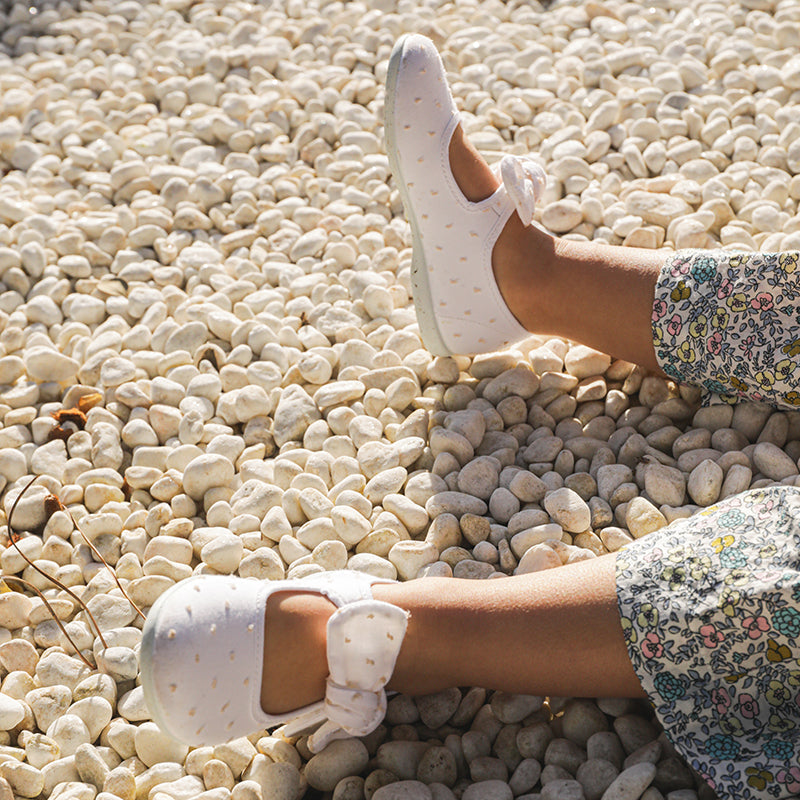 The Laura in white is a quintessential choice for formal occasions, featuring an all-over Swiss dot texture on breathable canvas. The design is highlighted by a large, structured bow on the adjustable velcro strap. Its clean, monochrome look is finished with a coordinated white non-slip rubber sole, offering a polished appearance for ceremonies and festive celebrations.