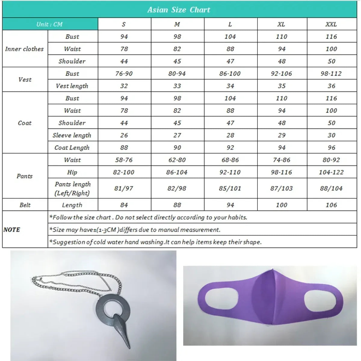 - Components: Complete set includes Top, pants, coat, vest, black gloves, purple gloves, belt, necklace props, waist accessories, and mask.