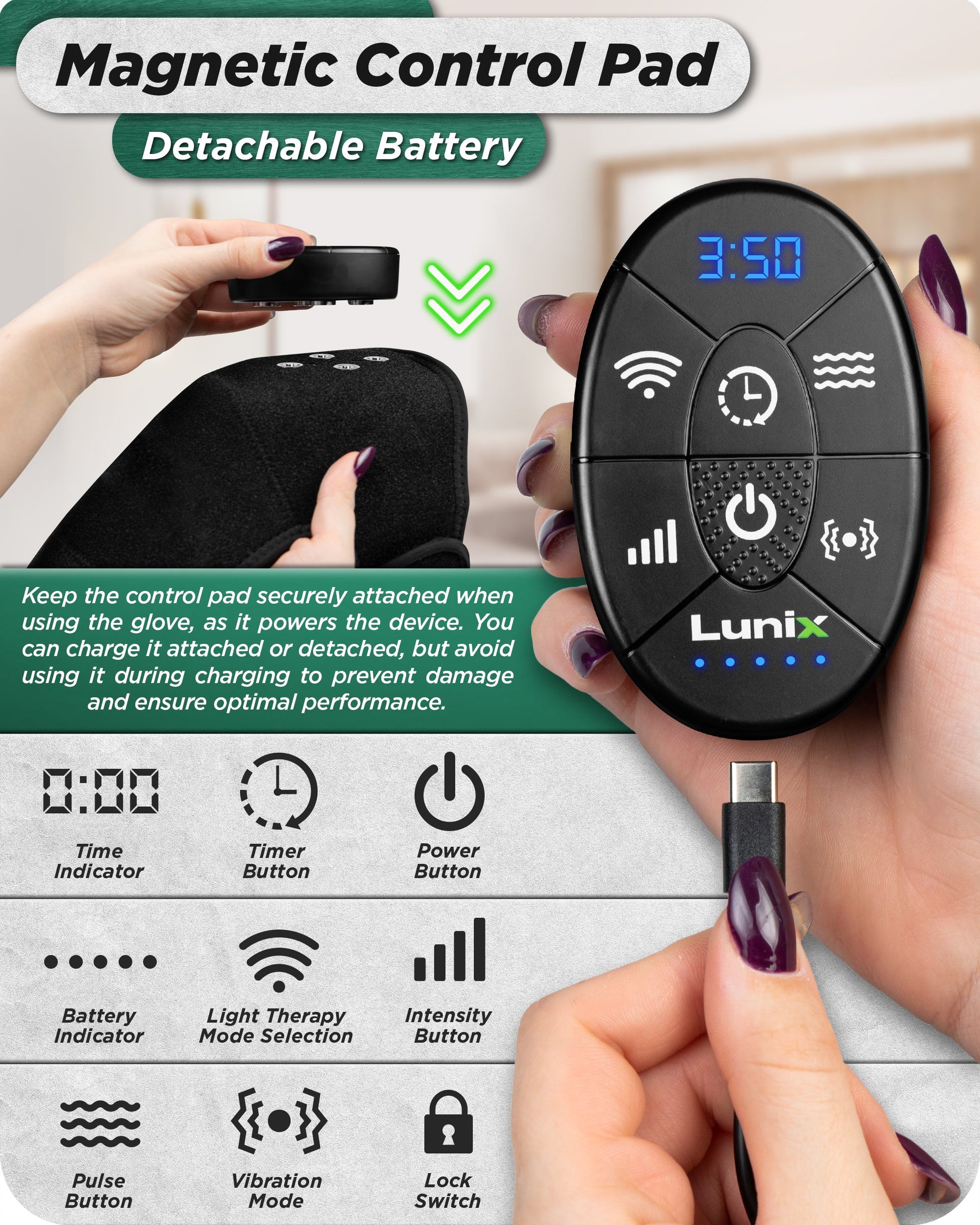 - Rechargeable & User-Friendly Design: The detachable, rechargeable battery ensures cordless convenience. With a simple control pad featuring a power button, timer, lock, and battery indicator, it's easy to use and manage your therapy sessions, promoting a hassle-free experience.