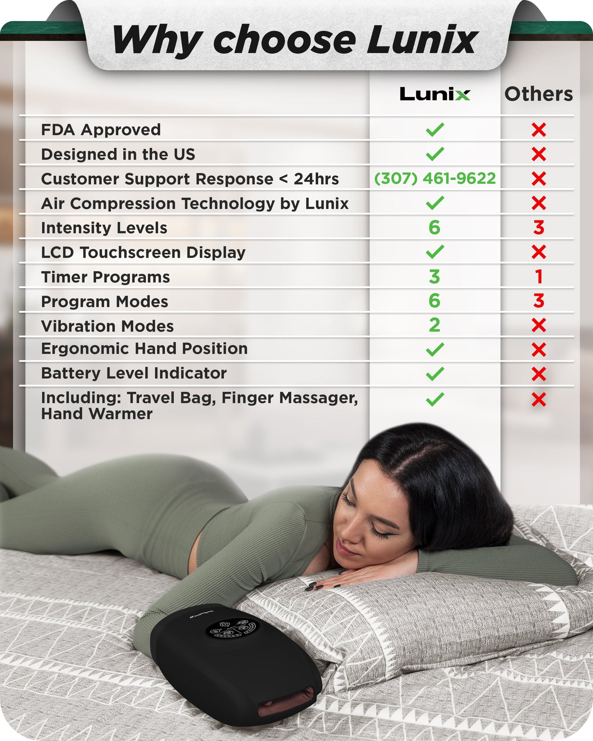 - ๐๐๐๐๐ ๐๐๐๐๐ ๐๐๐๐ ๐๐๐๐๐๐๐๐๐ hurt your sore fingers due to strong pressure or they just break after a few weeks, the Lunix LX3 pressure point therapy massager provides an intense massage of your hand and itโs 100%ย adjustable for your own needs. The unique 6 levels of massage & intensity combine compression, heat, and vibration to offer you the closest feeling to aย real hand massage whenever you need it. -Your priorities are important to us!ย
