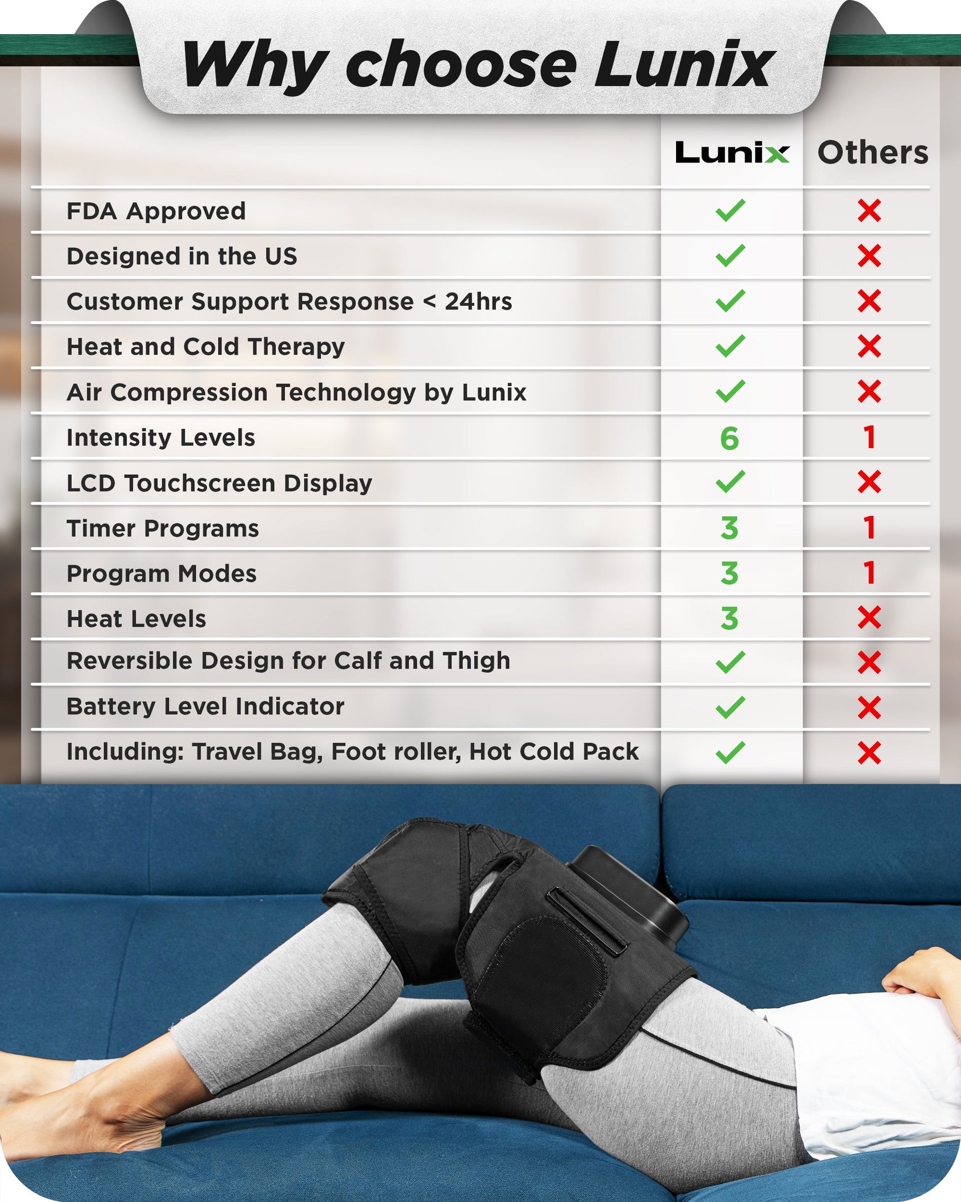 - ๐๐๐๐๐ ๐๐๐๐๐ย ๐๐๐๐ ๐๐๐๐๐๐๐๐๐ hurt your knees due to strong pressure or they just break after a few weeks, the Lunix LX4 knee massager with heat provides an intense massage of your knee, calf and thigh and itโs 100% adjustable for your own size. The 3 programs and the unique 6 levels of intensity and 3 levels of heat offer you the closest feeling to a real knee massage whenever you need it. โ Your priorities are important to us!ย