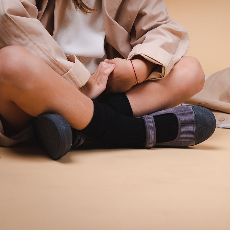 Our Mary Janes in soft grey corduroy are a seasonal essential. The understated neutral hue pairs beautifully with any outfit, while the durable corduroy fabric provides warmth and texture. Designed with a flexible, non-slip sole and a convenient Velcro® closure, these sneakers ensure little feet stay comfortable and secure from the classroom to the playground.