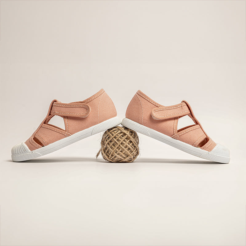Our Marly sandals in a soft peach canvas feature a timeless silhouette, these cap-toe sandals have been handmade from durable, machine-washable canvas. This model is designed with strategic side cut-outs to ensure maximum breathability during warm-weather play.