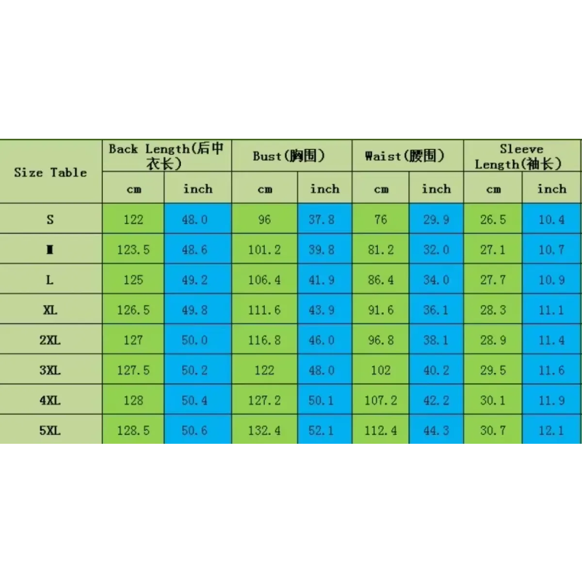 | Size | Back Length (cm/inch) | Bust (cm/inch) | Waist (cm/inch) | Sleeve Length (cm/inch) |