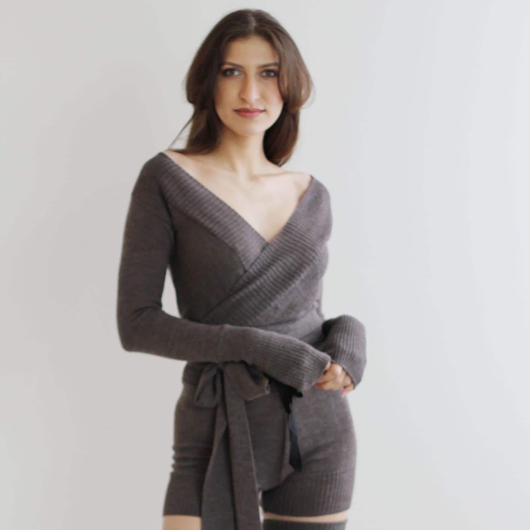 Womens cropped wrap style shrug in soft merino wool knit