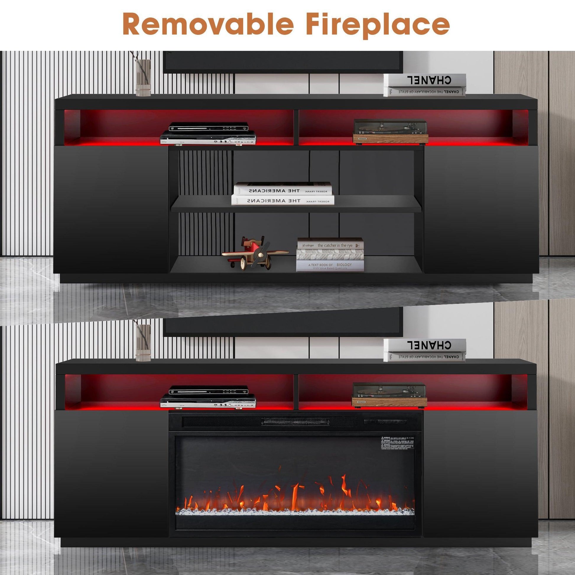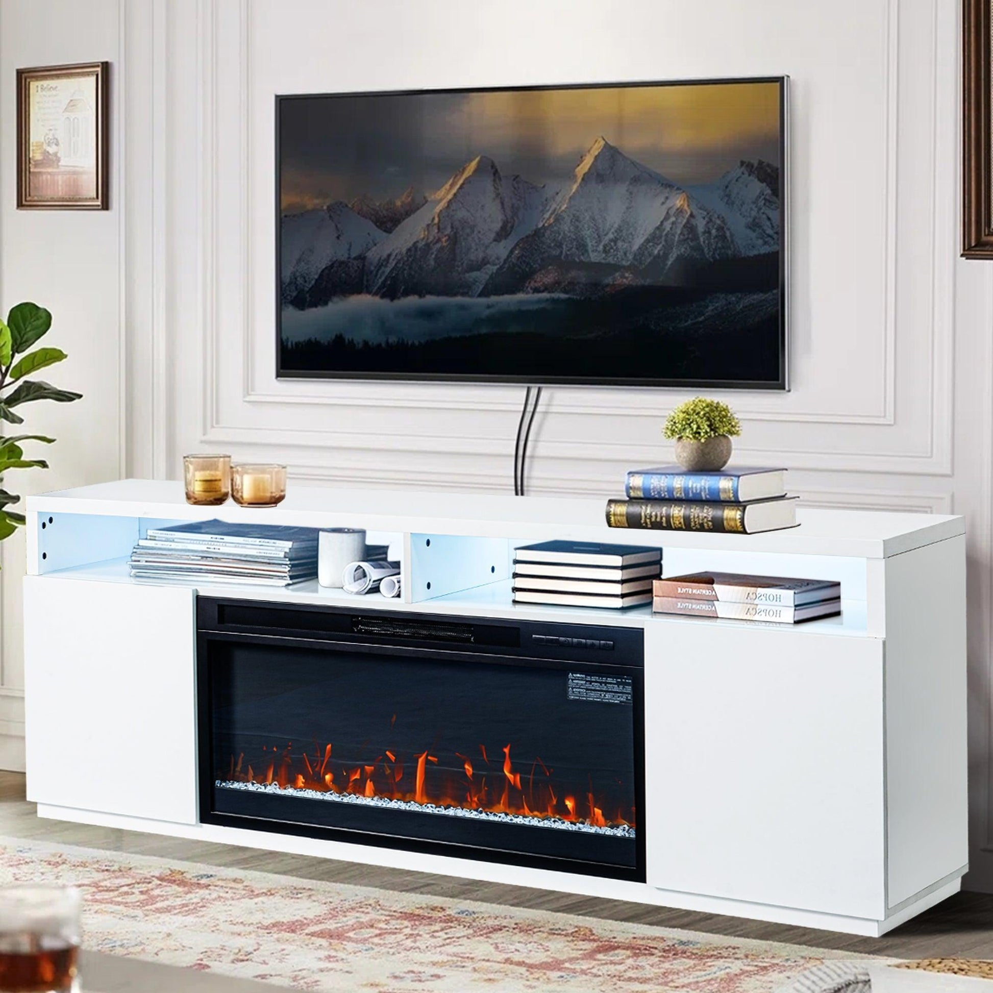 Modern 68" LED TV Stand with 36" Insert Opening Electric Fireplace for Living Room in Black or White