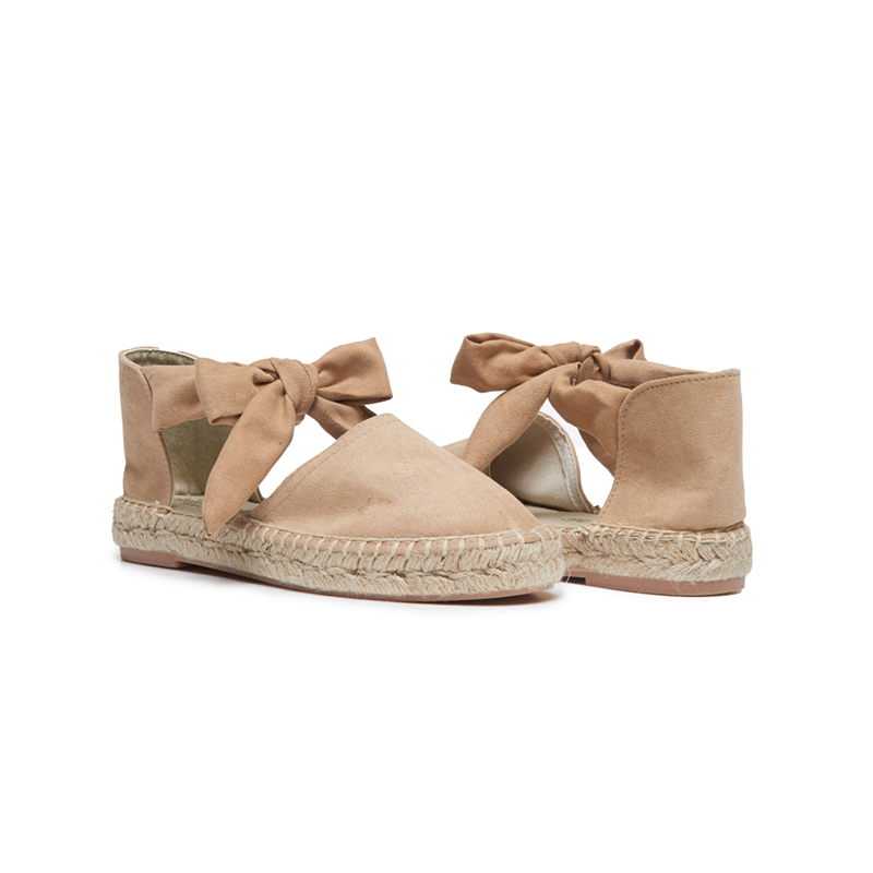 Our Montse espadrilles in nude suede are charming flats combine a traditional jute-braid sole with the luxurious feel of high-quality suede, offering a sophisticated look for the warmer months. The design is defined by delicate ankle straps that tie into a beautiful, feminine bow, ensuring a secure and adjustable fit.