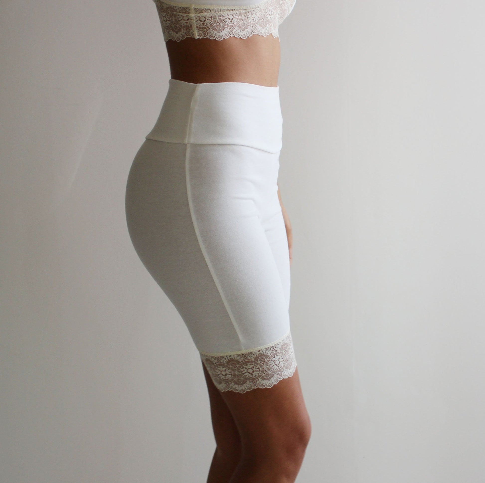 A high waisted yoked biker short with lace trim in organic cotton jersey