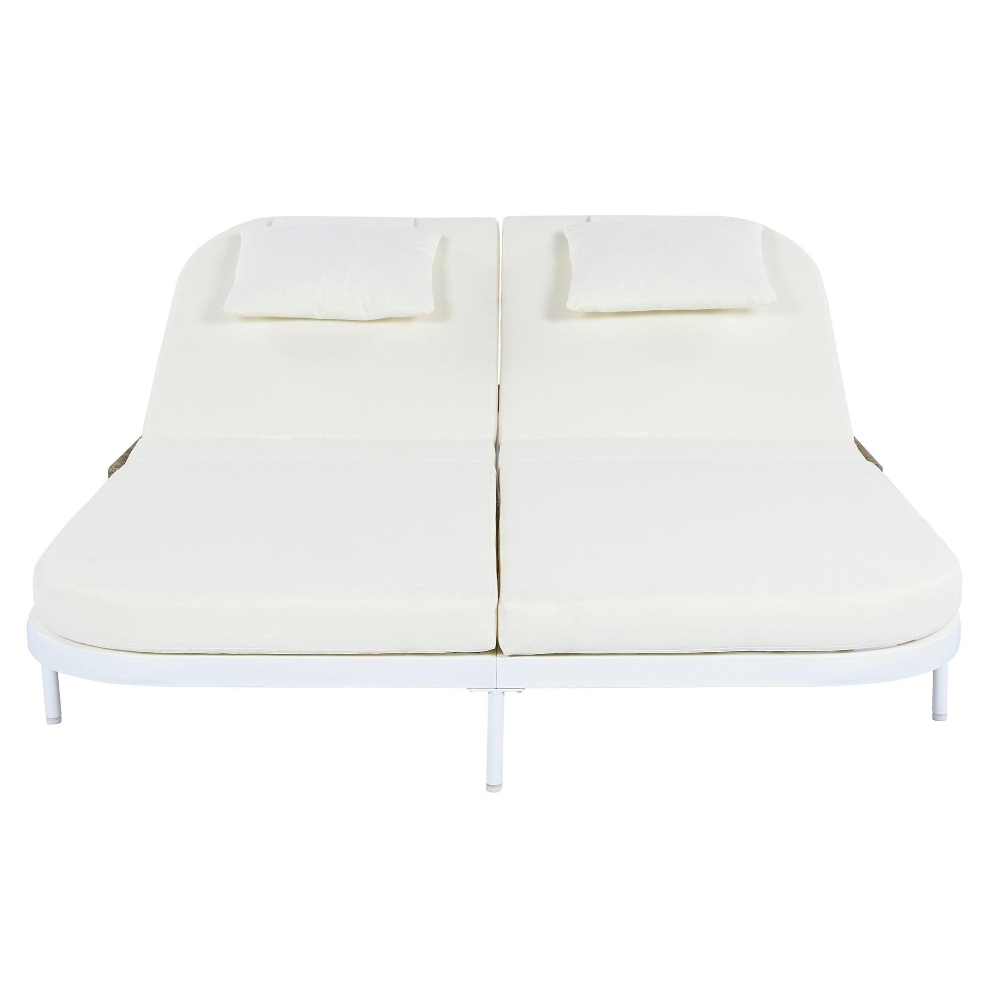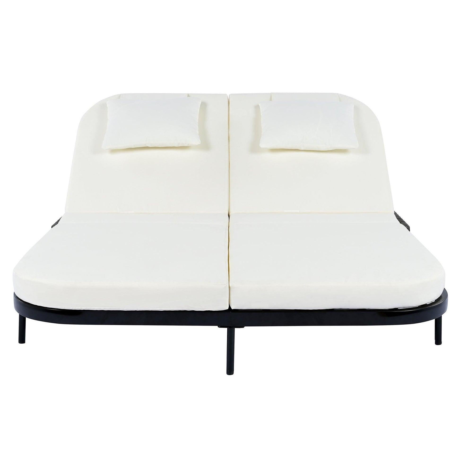 【Adjustable Backrest for Personalized Comfort】 :This outdoor daybed is designed with a sleek curved edge, perfect for two people to relax in comfort. The double daybed features independently adjustable 5-position backrests, tilt each side separately for sunbathing, reading, or napping. Customize angles to suit individual preferences effortlessly. The combination of wicker and metal frame creates a modern, durable piece of outdoor furniture that adds style to your patio, garden, or poolside.