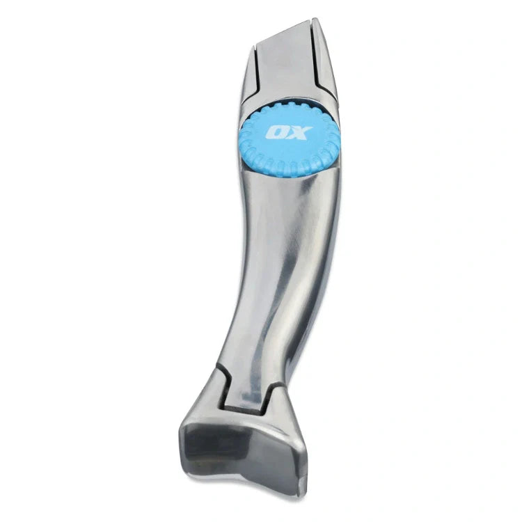 The OX Pro Heavy Duty Shark Knife is built for professional use. The knife is compatible with most utility and hook blades. The knife allows for easy blade replacement with a copper thumb screw opening. The integrated magnetic blade holder and magnetic blade magazine are used to secure the blade in place while closing and locking the knife. The knife comes with a carrying holster, making retrieval quick and easy.