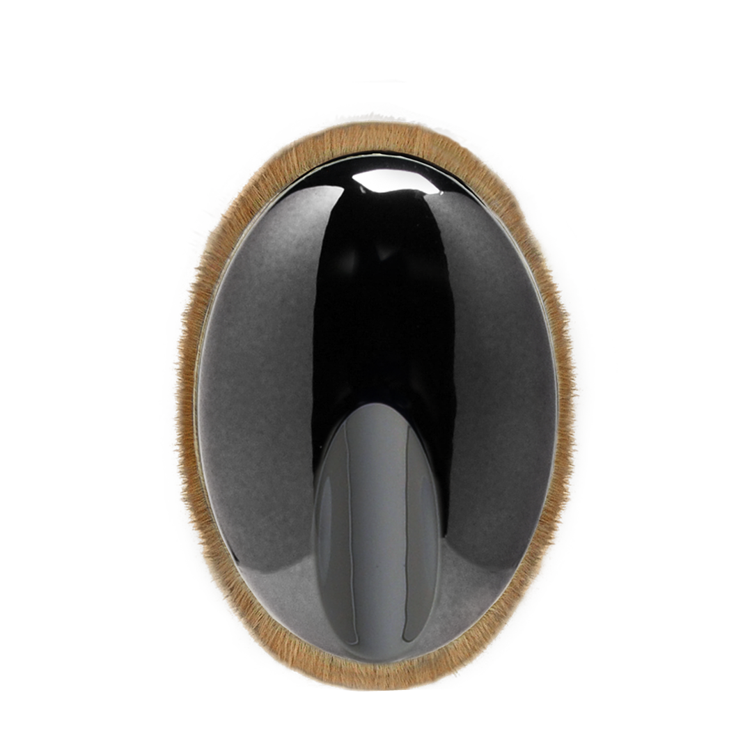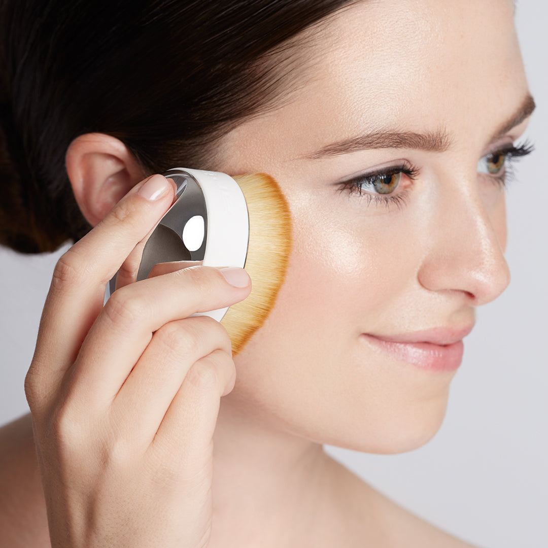 With the Palm Brush, you hold the entire brush in the palm of your hand with your fingers and move it gently across your face. This design includes a grip-pad encircling the brush, and finger-indent on top for improved stability and control when applying and blending product. The double oval design and unique bundle orientation is exclusively patented by Artis, and CosmeFibre® is trademarked.
