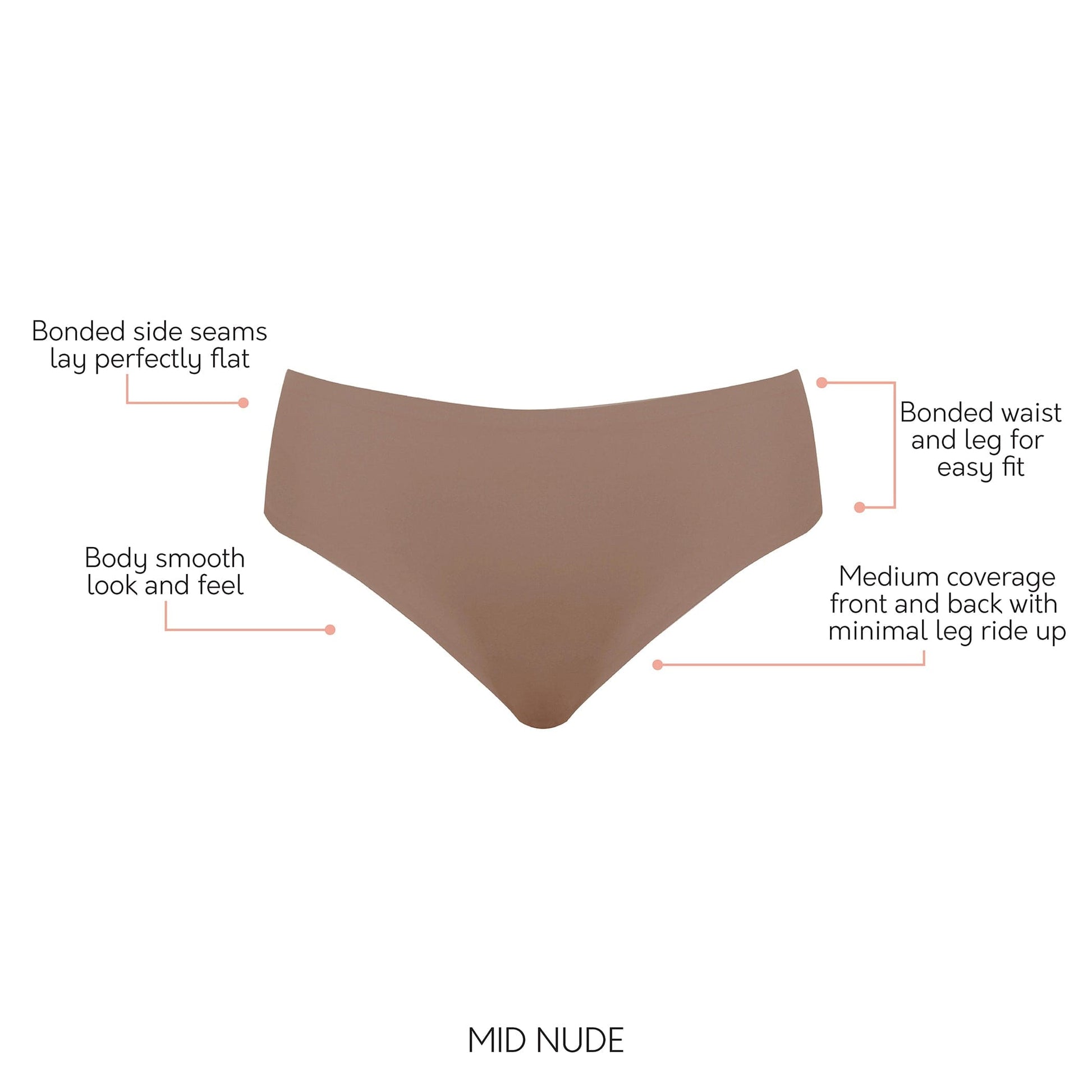 For the ultimate body-smooth look and feel, our Bonded Hipster is the perfect match! Our hipster features mid rise with a bonded waist and leg for easy fit with no visible lines seen under clothing.