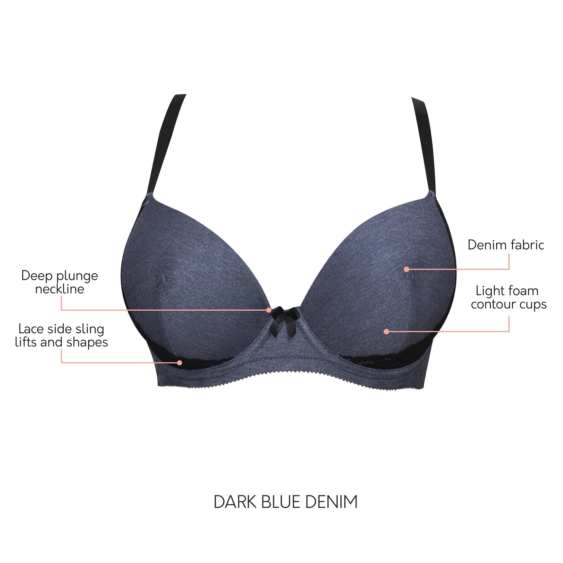 Our favorite T-shirt bra now available in Denim! Casey features a deep plunge and light foam contour cups. The pretty lace sling helps provide extra support and lift for full busted and full figured woman.