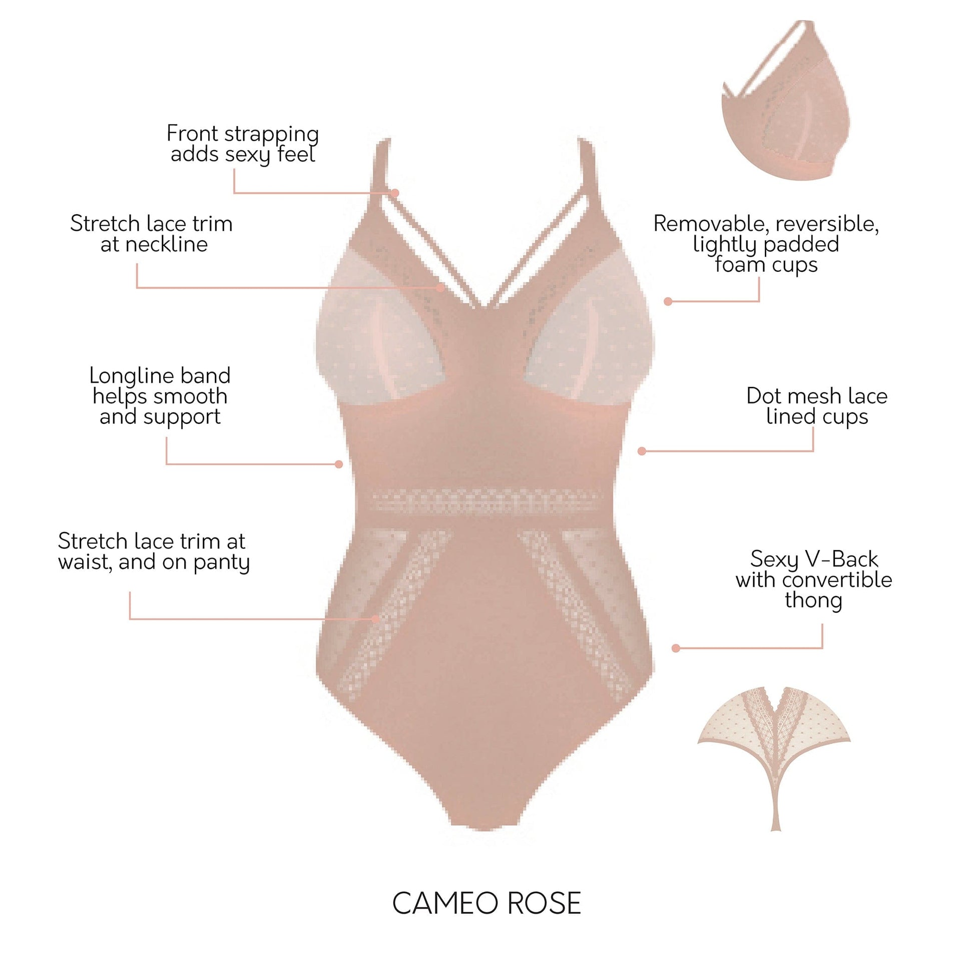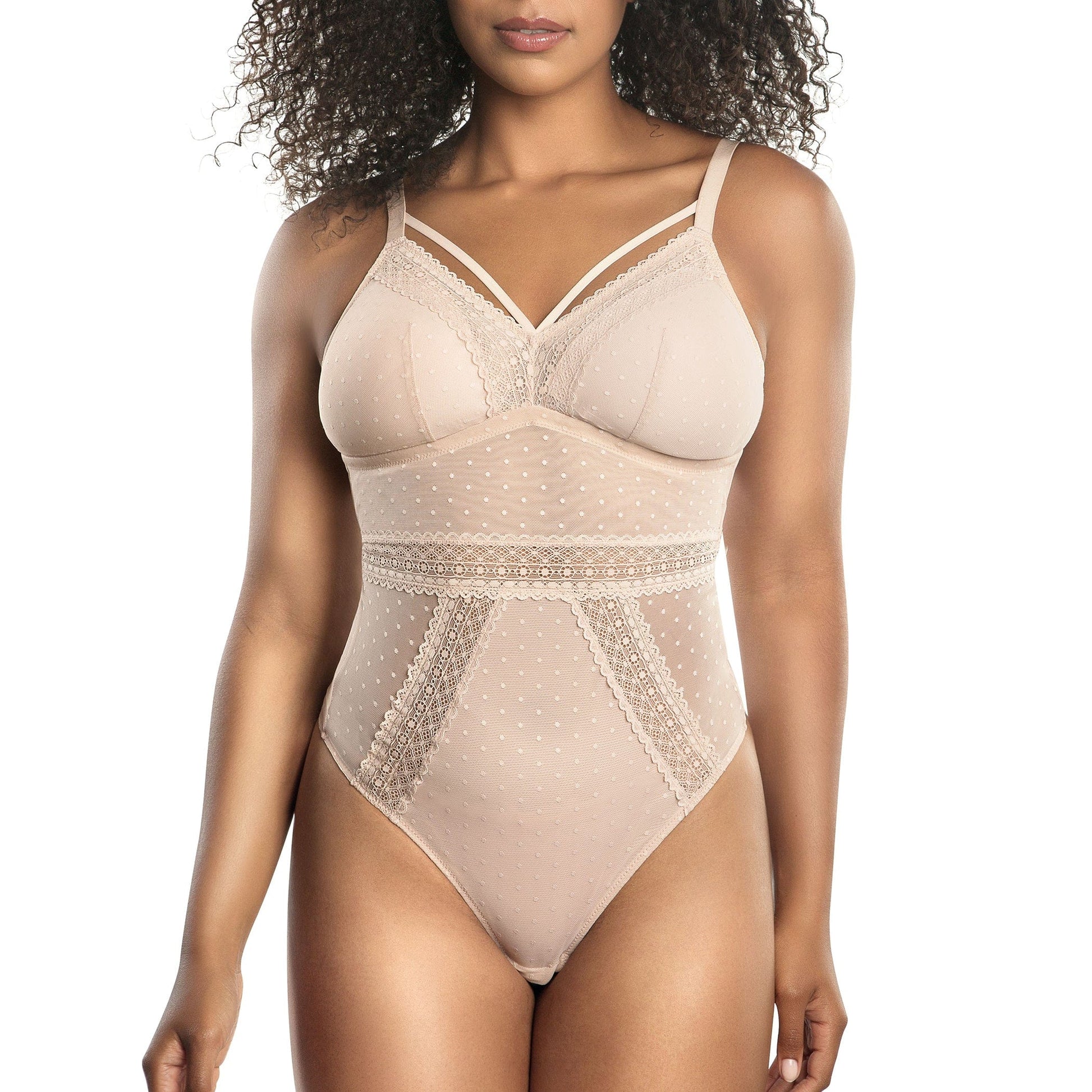 The perfect bodysuit for every body! Our Mia Dot bodysuit has wire-free, mesh dot lace cups with removable and reversible padding. The ultra-flattering V-shaped back and thong back ensure no visible panty lines. Perfect to wear alone or underneath clothing.