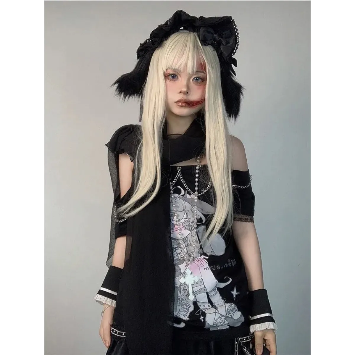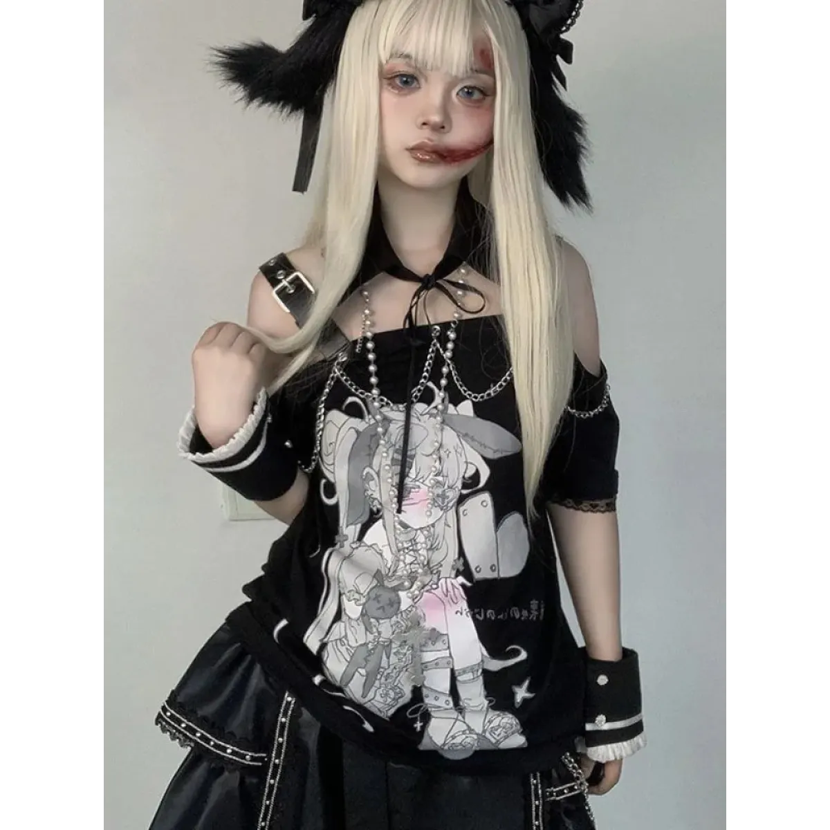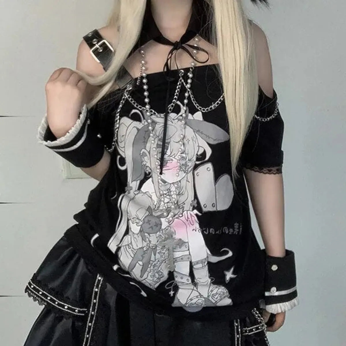 👗 Styling Tip 🌸 Show off your unique style by pairing this Pastel Menhera Off The Shoulder Tee with high-waisted jeans or a skirt. Its ACGN-inspired design and chain decoration add a touch of edginess to your look. Complete your outfit with some streetwear accessories for the perfect street-style ensemble.