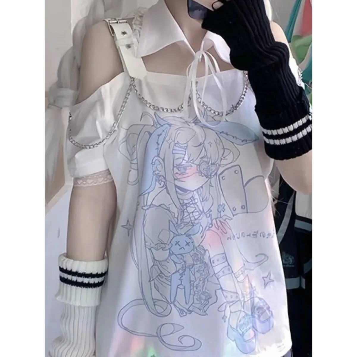 Elevate your style with the Pastel Menhera Off The Shoulder Tee from Kosahiki! This ACGN-inspired tee is a true fashion statement. Crafted with care in Mainland China, this tee is perfect for the summer season, providing comfort and style. Its regular length and unique chain decoration make it a standout piece in your wardrobe. With slight stretch and a loose fit, it's not just a tee; it's an expression of your style.