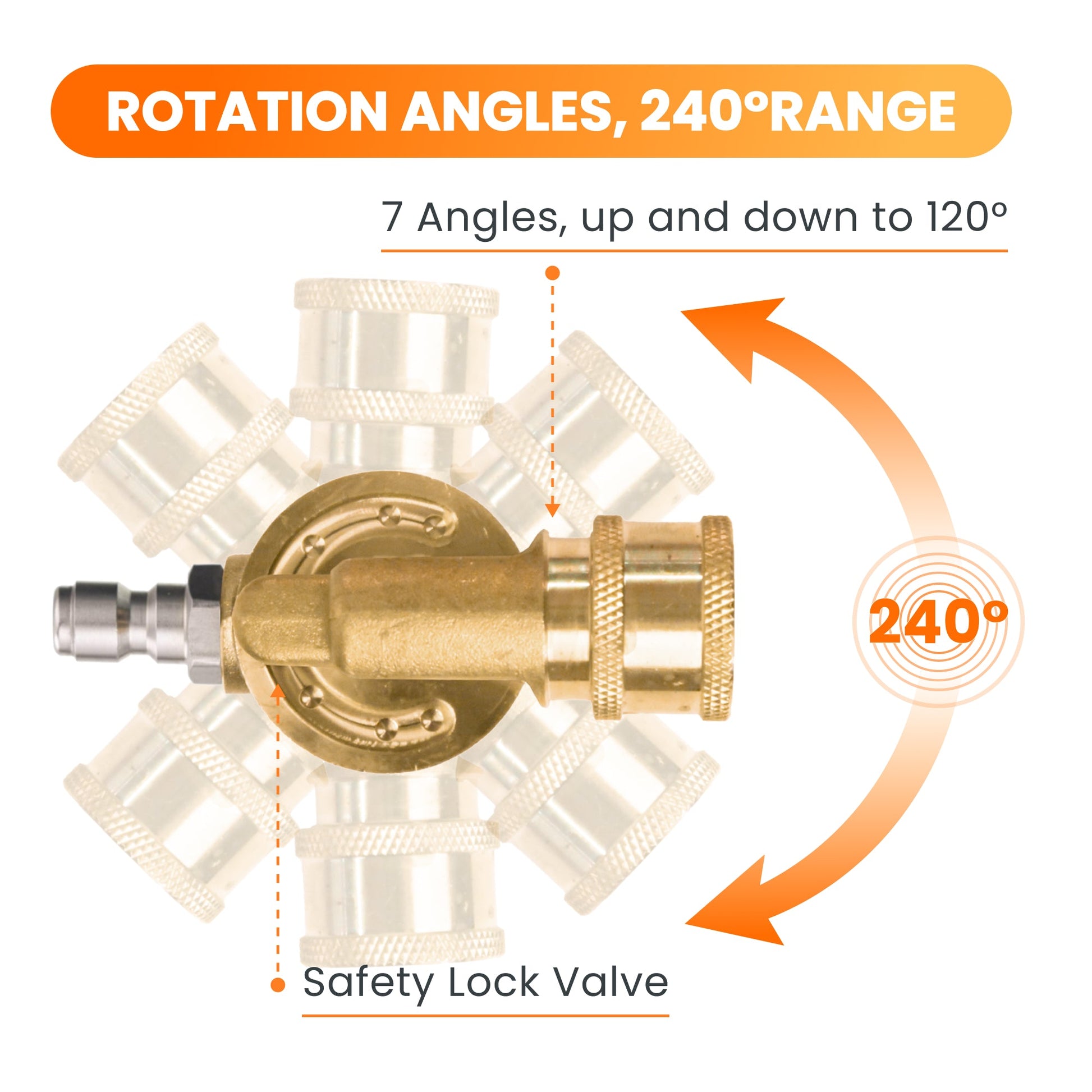 Giraffe Tools Pressure Washer Pivoting Couple, 7 angles, up and down to 120°, safety lock valve.